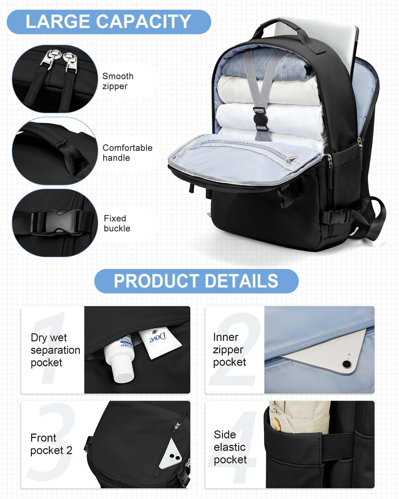 ✈【Flight-approved Travel Backpack】Size:17.72*13.39*5.9 inch. Weight: 2Lb/0.9Kg. Fits most airline regulations. Easy to put in luggage rack or under seats. Our backpack is not only perfect for travel, but also for everyday use. The trolley sleeve allows you to conveniently slide it over the handle of your luggage for easy transport. 👉【Separate Shoe Compartment Design & Wet Bag】Main pocket x 2, laptop compartment x 2 (fit for a 13” tablet and 14” laptop respectively), and many other pockets for different purposes. The wet bag is made of high density water resistant material can help you to separate dry items and wet items,if you have wet clothes or towel,you can put it in wet bag. A separate shoe compartment can help you carry and keep your shoes better in your travel bag. ✅【Smart and Convenient】 Designed with the modern traveler in mind, our backpack features a built-in laptop compartment, so you can keep your electronics safe and secure. Plus, the USB charging port allows you to stay connected on the go. No more searching for an outlet in crowded airports or stations. 😘【Anti-theft Multifunctional Backpack】There is a zipper pocket on the back of the bag, which can store valuables such as mobile phones and iPads, which is anti-theft and convenient. Multifunctional Daypacks:Hybrid (Backpack/Duffle Bag/Shoulder Bag/Travel Bag) conversion. Can be used several different ways. It can be served as everyday backpack,spacious college bookbags, professional backpack for laptop or daily use at anywhere for weekend getaway,occasional. 📦【BUY WITH CONFIDENCE】Does your partner like to travel? It's an ideal gifts for traveler. It's also a practical Christmas and New Years gift for your parents, traveler. The best gift choice for Thanksgiving Day, Christmas, New Year, Valentine's Day, also available as travelers giftsWe always stand behind the quality of our product. If you have any issues, we're very happy to either provide a no-questions-asked refund or replacement. ORDER NOW WITH NO RISK!
