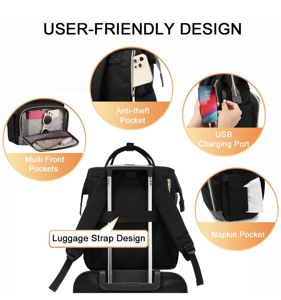 Laptop Backpack Women Teacher Backpack Nurse Bag Work Backpack Purse 15.6-Inch. ✈【15.6 Inch Larger Capacity & Multi Organized Pockets】: Dimension-12"L x 7.5"W x 16"H(airline approved), Weight: 1.83 lbs. 20L large capacity, 2 compartments and 18 pockets. Easy to organize your glasses, wallet, keys, earphone, power bank, cell phone, document and baby essentials, etc. 🔋【USB Charging Port & Anti Theft Design】: Built-in USB port design allows you conveniently to charge cell phone by connecting power bank without opening laptop backpack on the go or airplane travel, day trip, workout, office, work, etc. With a hidden anti theft pocket on the back, this work backpack protect your valuable items from thieves. ✅【Carry in Comfort】: Adjustable and breathable padded wide shoulder straps release your pressure on back and shoulder. A luggage strap allows backpack for women fit on luggage/suitcase, making your journey and travelling more convenient wherever you go. 💪【Durable School Backpack & stylish Look】: Made of high-quality and sturdy nylon material, this waterproof backpack features reinforced seams and steel frame of the main compartment which keep the perfect shape of the bag. Perfect for university, travel, business, daily use and outdoor activities. An ideal choice as bookbag, work backpack purse, nurse bag, docctor backpack, teacher backpack, school student backpack, travel bag, etc.