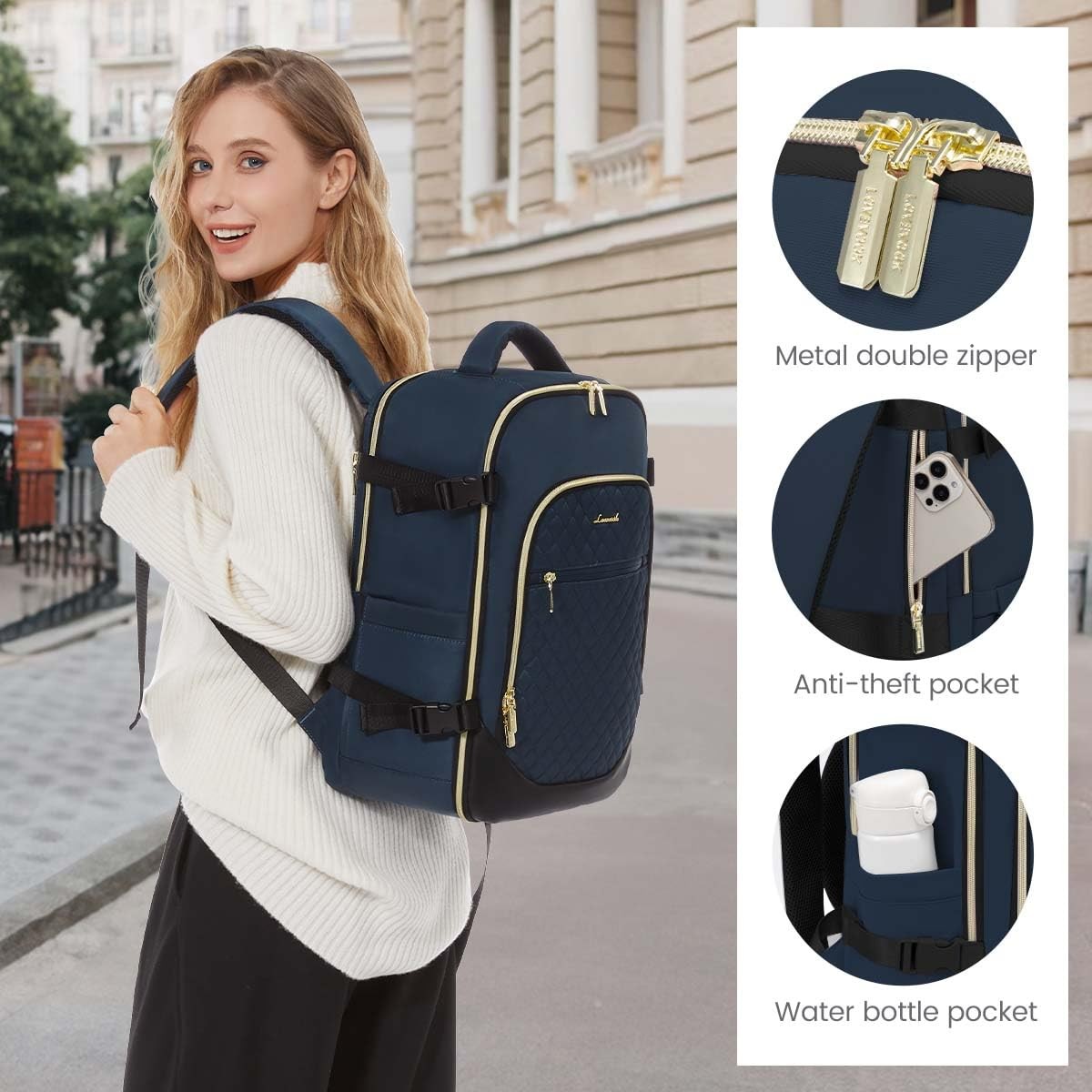 Personal Item Travel Bag: The 30/35-L Large Capacity Travel Backpack! Whether you're jet-setting for work, traveling with friends, or simply hiking errands around town, this backpack is a travel essentials backpack choice for any woman Carry-on Backpack for Airplanes: This travel backpack meets the maximum size IATA flights allow, fitting comfortably overhead and under-seat. Approved by top budget-friendly airlines like Spirit, Frontier, and JetBlue, you can easily breeze through airport security as the backpack opens freely to 90-180 degrees Medium Luggage Backpack: With a spacious capacity and 4 compartments, organizing your travel essentials has never been easier. The separate padded 15.6-inch laptop compartment is perfect for TSA checkpoint convenience, while the elasticated side pockets hold your water bottle and the hidden back pocket keeps your IDs secure Weekender Bags for Women Travel: Designed for on-the-go convenience, this backpack features a luggage strap on the back to securely fit on the handle of a rolling suitcase, allowing you to travel hands-free. Handle options on the top and side provide extra accessibility for your belongings Ideal Gift: Made of lightweight waterproof fabric and adjustable buckles, this backpack is comfortable to wear, both in style and capacity, it is very suitable as a holiday or birthday gift, which will bring surprises to users