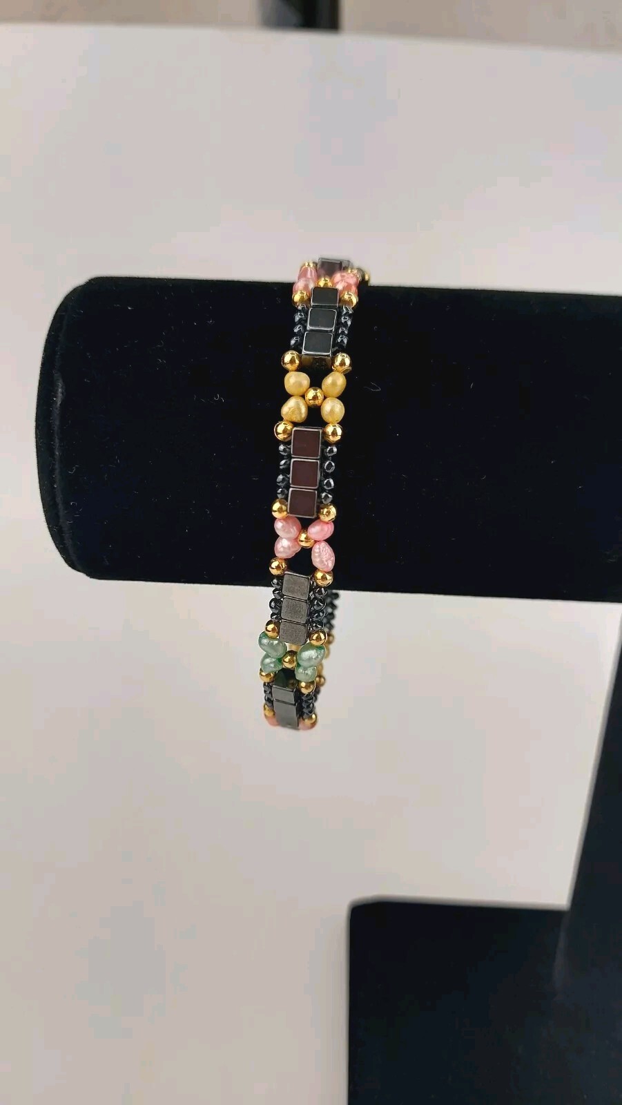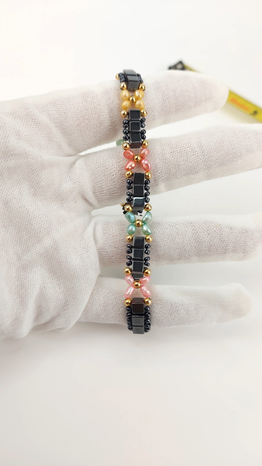 Adorable and unique anklet bracelet. Real freshwater pearls have been dyed pastel colors. Squar hematite beads surrounded by black glass sead beads and gold tone accents. Measures 8" long by 3/8" wide. Feels good on!! Please zoom in on all photos for overall condition.