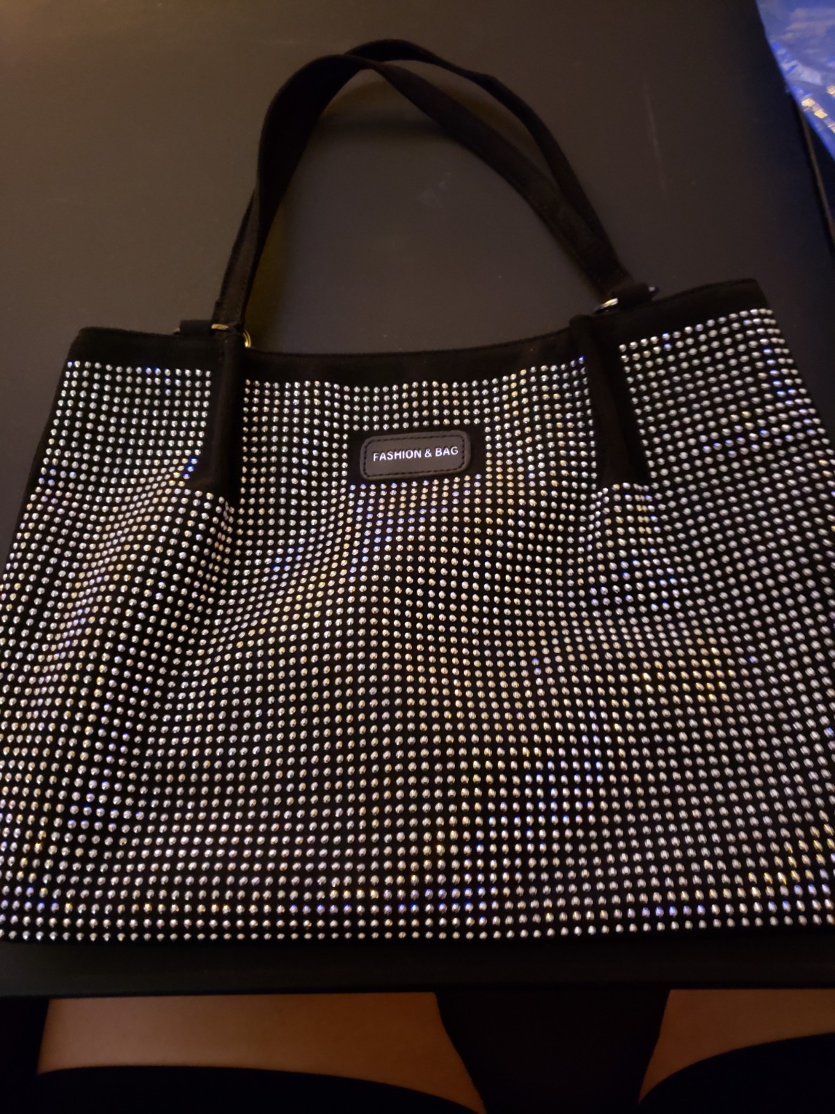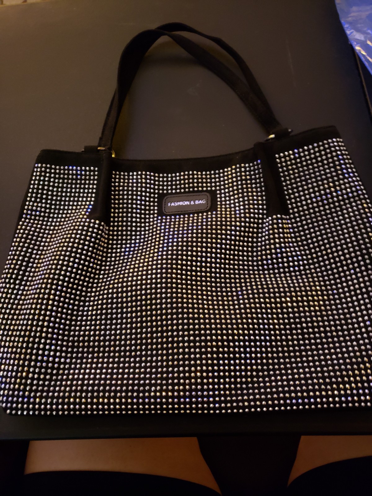 This Women's Bag is a stylish black tote with a square shape and a large size, perfect for carrying all your essentials. The bag features double black handles, a snap closure, and inner pockets for organization. The exterior is made of metallic fiber with rhinestone accents, adding a touch of glamour to your outfit. It also includes a detachable strap for added versatility. Perfect for any fashionable woman looking for a chic and functional handbag.