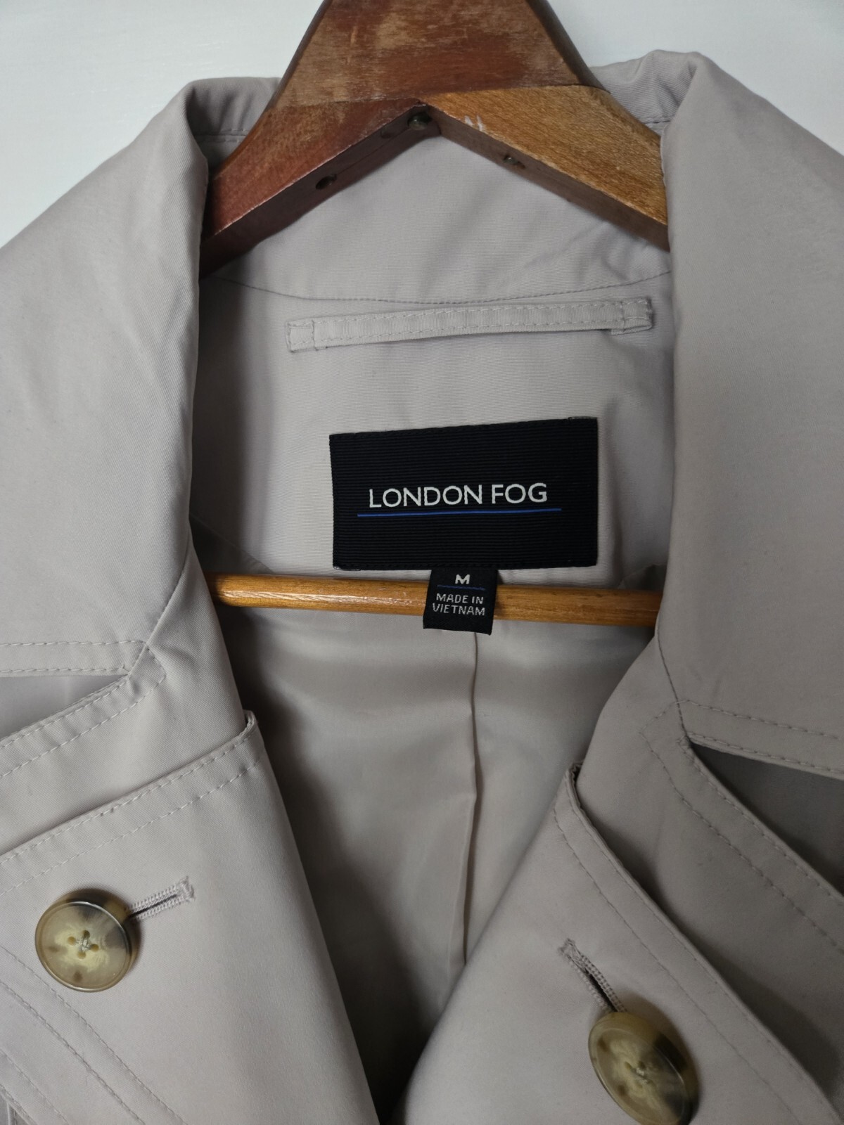 13 inches long 18-inch pit to pit This women's London Fog trench coat in beige, size M, features a classic mid-length design with long sleeves and a belted waist. Made of lightweight polyester, the coat is perfect for casual or business occasions during the fall and spring seasons. The button closure adds a timeless touch, while the polyester lining provides comfort and warmth. With its solid pattern and London theme, this trench coat exudes a classic and sophisticated style that is versatile for various settings.