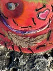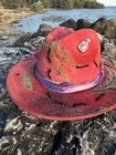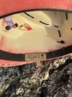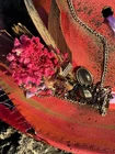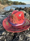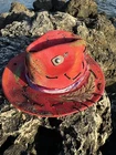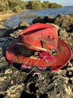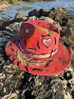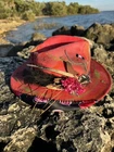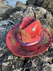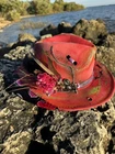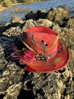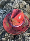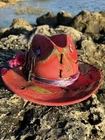 All Tazzle’s 1of1 hats are custom, one of a kind pieces of art. Hats are adjustable and sizing material will be shipped with your order. This hat is brightly colored w/ leather, metal, and cloth accents. SKU 8466