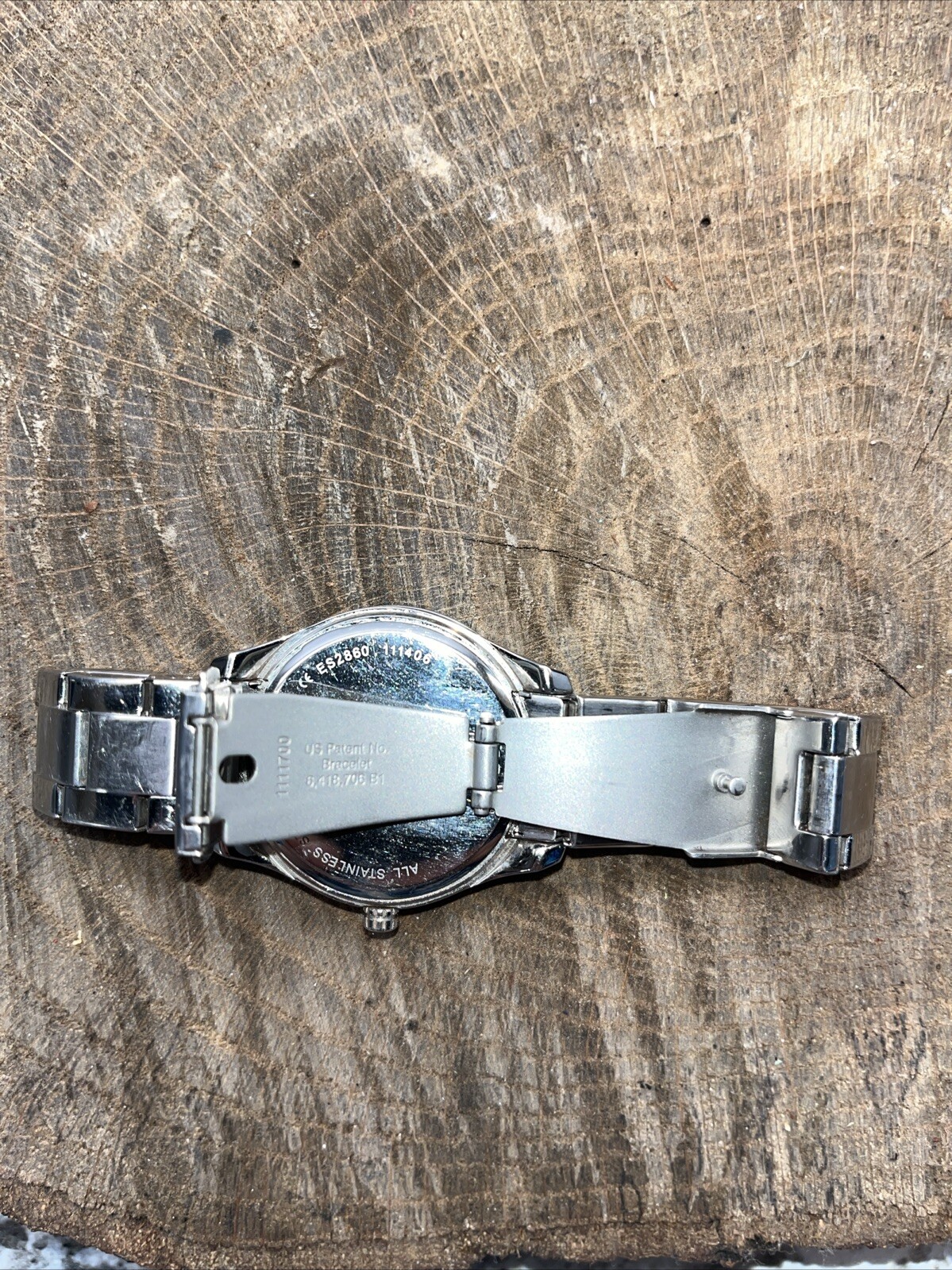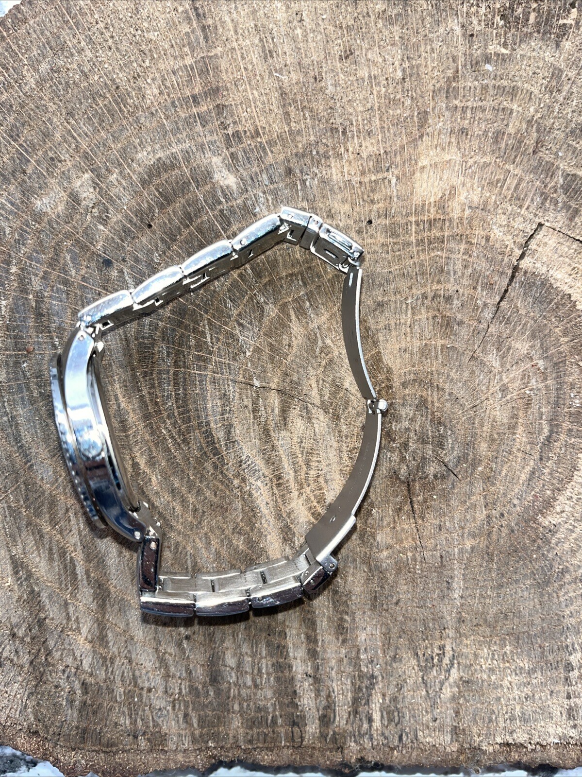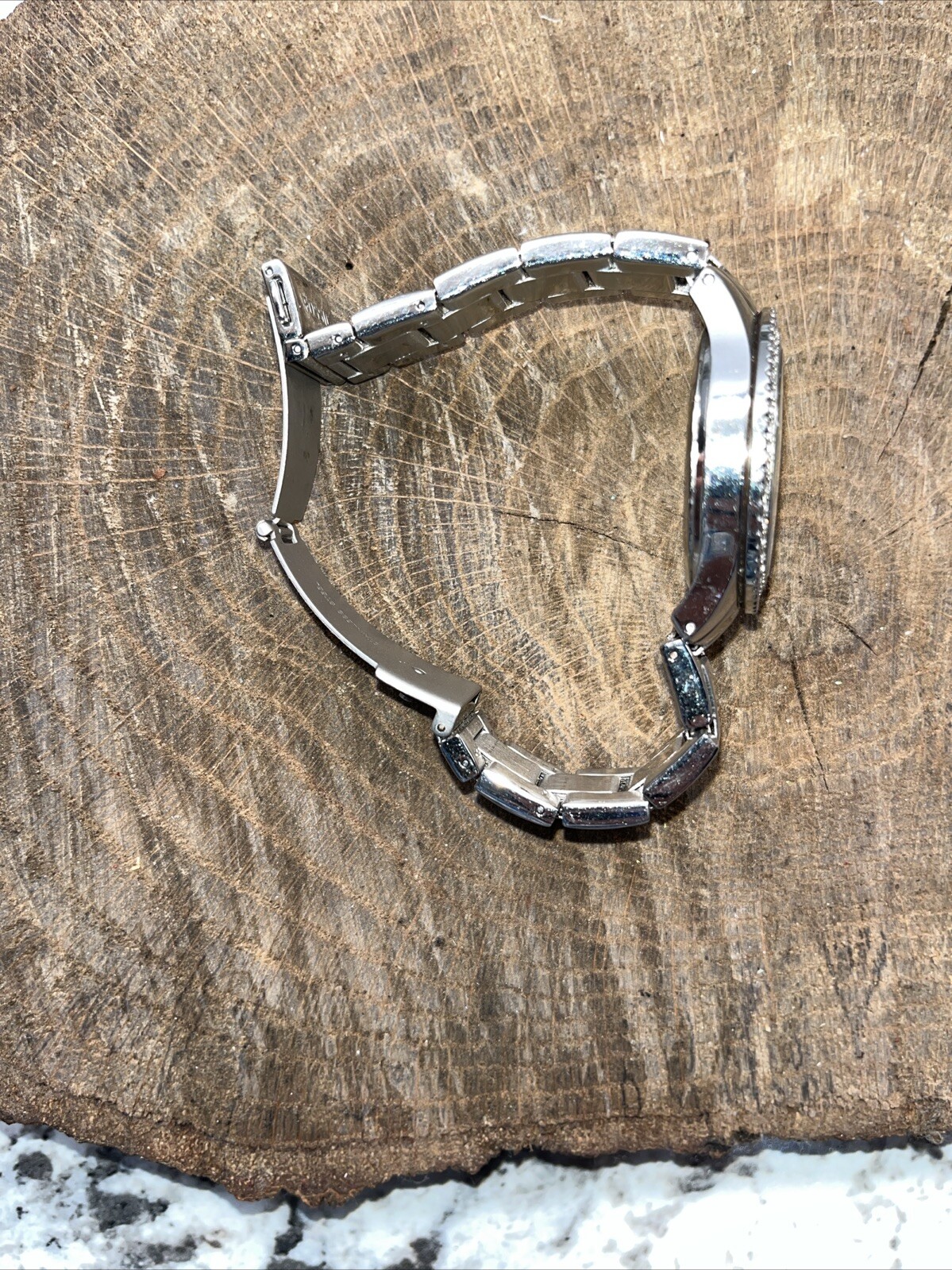 This Fossil ES2860 wristwatch is a stunning addition to any casual outfit. With a round, polished stainless steel case and rhinestone bracelet, this watch is both elegant and practical. The mother of pearl dial features stick indexes and a quartz movement, ensuring accurate timekeeping. The watch is water-resistant up to 50 meters and comes with a fold-over push-button deployant closure, making it easy to adjust to fit wrist sizes between 6.1-6.25 inches small wrist size. This Fossil watch is a perfect choice for women who want a stylish accessory that can be worn every day. Sold as is, needs battery, fast shipping:)