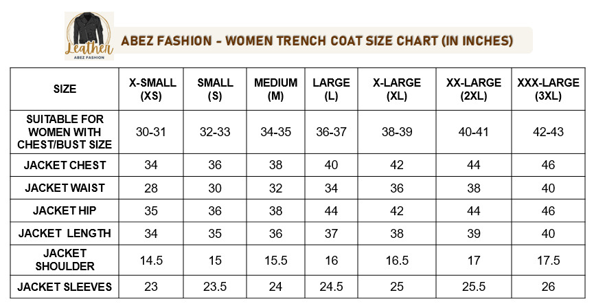 Abez Leather Fashion Item Details Women's Genuine Leather Long Coat Real Lambskin Stylish Black Belted Trench Coat Make a lasting impression with this elegant women's black long coat, crafted from 100% pure lambskin leather. Designed for formal wear, this classic coat adds a touch of sophistication to any outfit. The luxurious lambskin leather ensures a soft, comfortable fit while offering a timeless look that’s perfect for formal events and upscale occasions. - Made from 100% genuine lambskin leather for premium quality and comfort - Classic long coat design in a rich black color for a refined style - Perfect for formal wear, special events, or elevating your everyday look - Soft, durable leather ensures long-lasting wear - Ideal for women who value elegance and luxury Step out in style with this classic lambskin leather coat. Available now in all sizes! Size and Color Consult the provided size chart in the image to ensure a perfect fit. Follow the instructions for accurate measurements. Unsure about sizing? Send us a message with your body measurements, and we'll tailor your jacket accordingly. Enjoy our FREE CUSTOMIZATION service to meet your specific requirements; simply get in touch with us. Explore a variety of COLORS by contacting us for your preferred choice. We Also Accepted Bulk Orders. Customize/Tailor Made Leather jacket for Men & Women in Sheep / Lamb antique leather jacket Customize your order to meet your specific requirements. Dear Customer, Please answer the below questions in order to serve you better : Shoulder = Chest = Arms = Waist = Sleeves = Tummy = Length of jacket = HIP = Actual height = Style = Regular or Slim Fit Shipping Information Color of actual product may vary due to photography/light effects & also due to computer screen resolution and color settings. Buyer will bear custom-duty/Import duty charges. Orders are shipped using DHL or FedEx, occasionally utilizing India Post based on location and service accessibility. The Accessories of the Leather item such as Button, Zippers, & color might differ due to material availability in the market but we use Premium Quality only. Return Policy If you find that product is not as per product detail, we will accept a return for Item within 30 days of receiving item in original condition as it was sent and we will refund you EXCLUDING shipping charges. Buyer is responsible for return shipping & handling charges. A request you to Please don't leave negative or neutral feedback, if any problem with the product, you should contact us first and also don't open a case, first contact us we will fully help the buyer to resolve their problem. THANK YOU