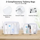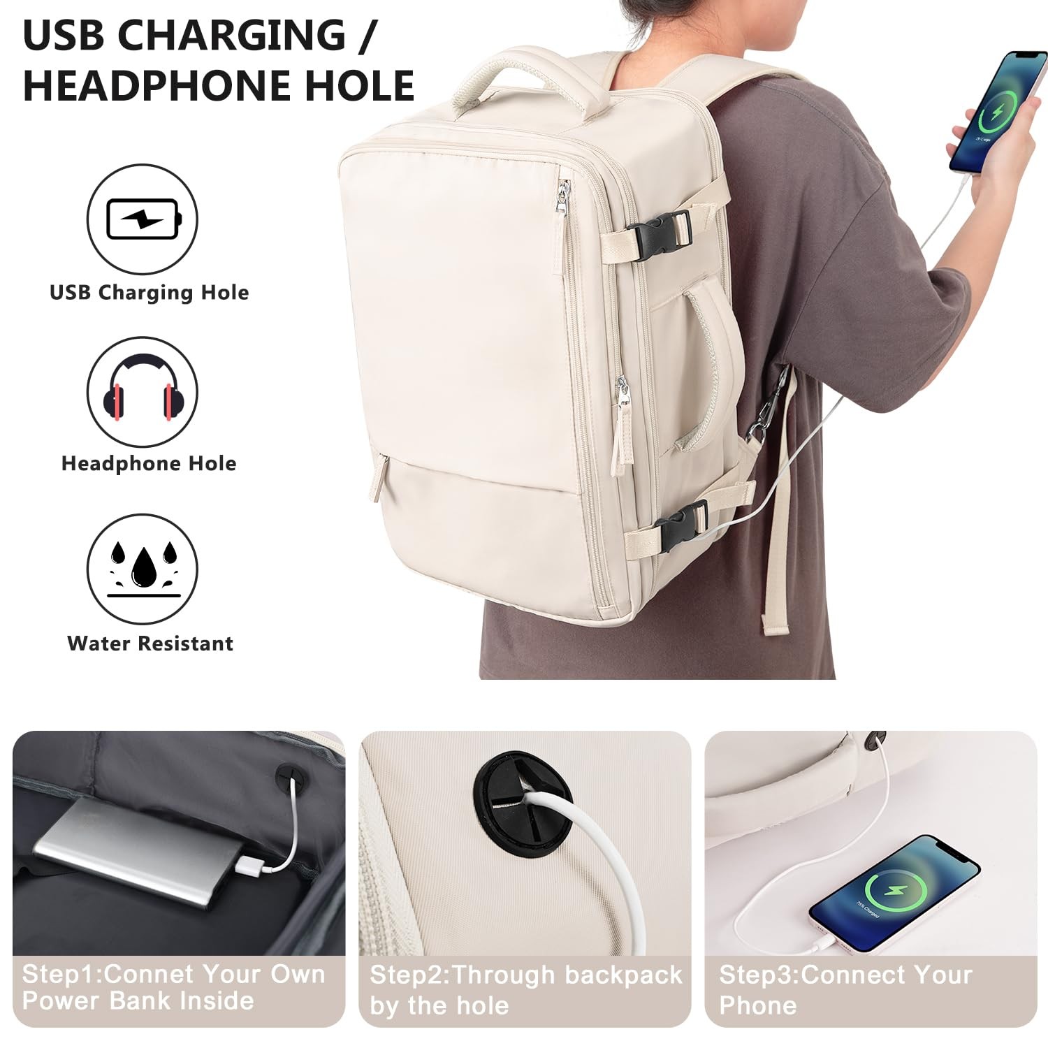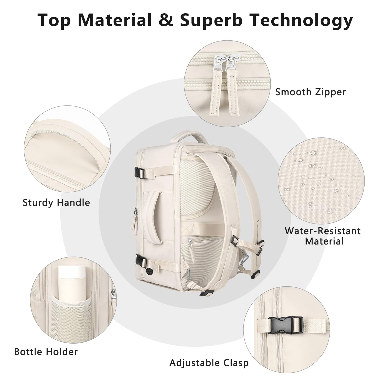 Features for Travel Laptop backpack. 1. The water bottle pocket is designed for water bottle or umbrella, etc. 2. The laptop compartment is suitable for 17.3” laptop or 12.9” tablet, and the thick padding is to protect the electronic products from bumps. 3. The wet and dry separation. Travel supplies partition storage more organized; 4. The charging port is designed for charging mobile phones/tablets anywhere, anytime; 5. You can place the backpack on the suitcase to liberate your hands and back due to the luggage straps of backpack; 6. The anti-theft pocket on the back of the backpack to prevent loss of valuables such as cell phone, id card or passport while standing in line or walking; Package: large travel backpack + 2 toiletry bags Color: black / pink / beige / gray & purple / blue & green Material: polyester Size: 16.5*11.4*7.8 inches (42*29*20cm) Weight: 2.5 lbs (1.15kg) THIS ITEM IS NOT INTENDED FOR USE BY CHILDREN 3 AND UNDER. Padded Laptop Compartment & Large Capacity: The padded laptop backpack 15.6 inch hold as well as 15 Inch,14 Inch and 13 Inch Notebook/Laptop. laptop and also protect electronic products from bumps. In addition, the backpack has a large capacity , a dry-wet compartment and several pockets, So our laptop travel backpack can your trip is just organized Charging Hole & Anti-Theft Design: Our carry on backpack have charging hole desgin allows data cable pass through, so you can charge your phone while walking. Also, the anti-theft pocket on the back of the travel backpack for women mens allow you to put phone, passport or wallet in it. Making your journey and travelling more convenient wherever you go Personal Item Backpack: travel backpack carry on flight approved size is 16.9*11.8*7.87 inches(L x W x D) and weights 2.5 pounds(1.14 kg). It meets airline personal-item requirements. If you don't want to carry it on your back, you can stow the backpack's straps and it's a compact suitcase 2 Complimentary Toiletry Bags: The package comes with two waterproof clear bags, measuring 8.07 x 5.91 x 2.36 inches and 6.69 x 4.72 x 2.36 inches. The clear bag stores the washing articles neatly and cleanly and has the advantages of convenient Top Material & Superb Technology: Our travel backpack are made of top 290 twill composite fabric. There are 148 procedures involved in the manufacture to ensure the quality. The backpack is waterproof and keep your items from getting wet