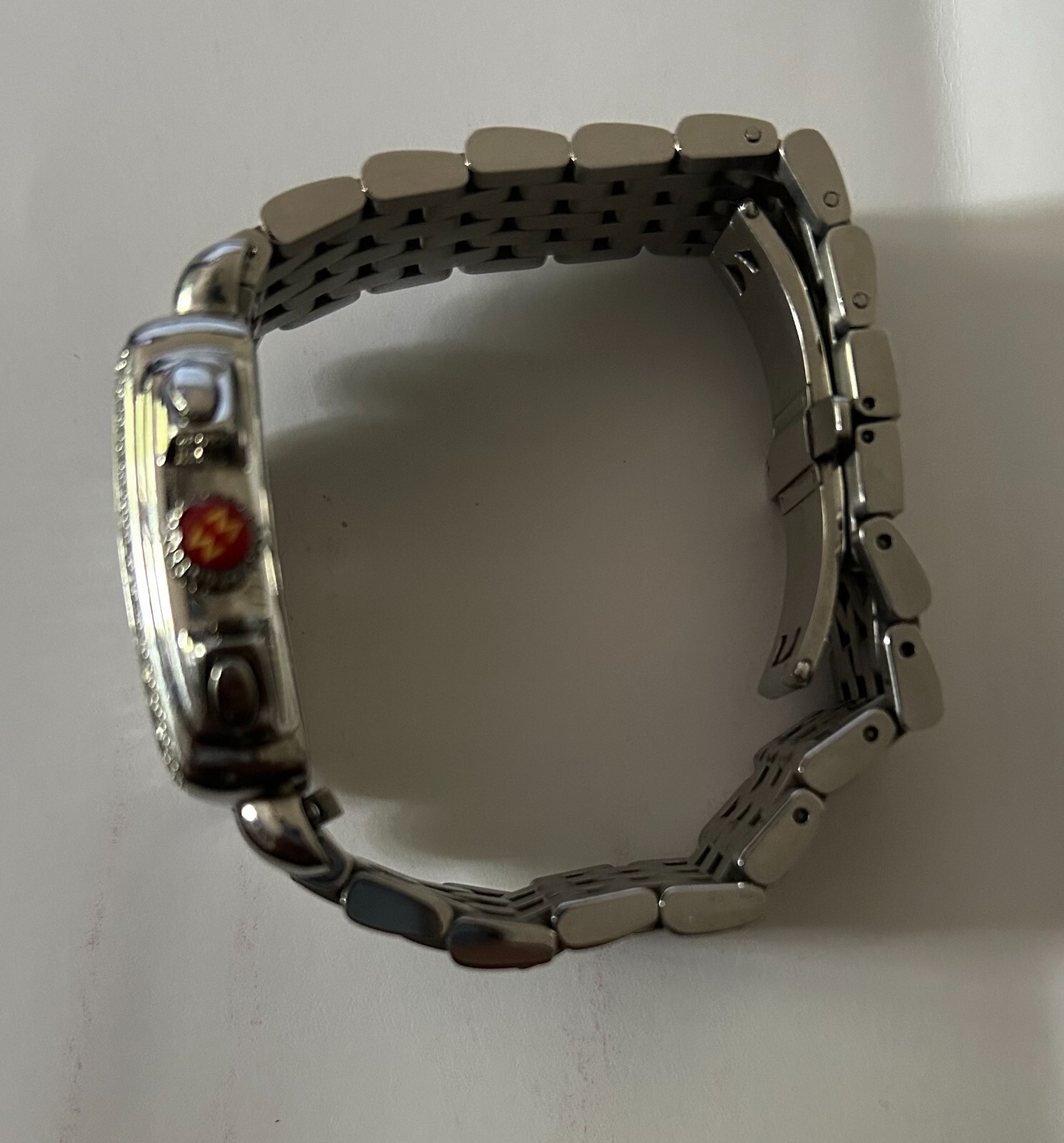 Bezel Type: Compass, Diamond Model: MICHELE Deco Caseback: Screwback Type: Wristwatch With Manual/Booklet: No Dial Color: Silver Band Color: Silver Year Manufactured: 2000-2009 With Service Records: No Band Material: Stainless Steel With Papers: No Watch Shape: Rectangle Case Size: 33 mm Indices: Diamond Markers Style: Casual, Classic, Dress/Formal Reference Number: 832874SS Bezel Color: Silver Country/Region of Manufacture: Switzerland Seller Warranty: No Case Material: Stainless Steel Brand: MICHELE Water Resistance: 50 m (5 ATM) Features: Chronograph Handmade: No With Original Box/Packaging: No Band/Strap: Bracelet Customized: No Dial Pattern: Mother of Pearl Theme: Letters, Numbers & Symbols Display: Analog Number of Jewels: 108 Movement: Quartz Department: Women Closure: Double-Locking Fold-Over Clasp