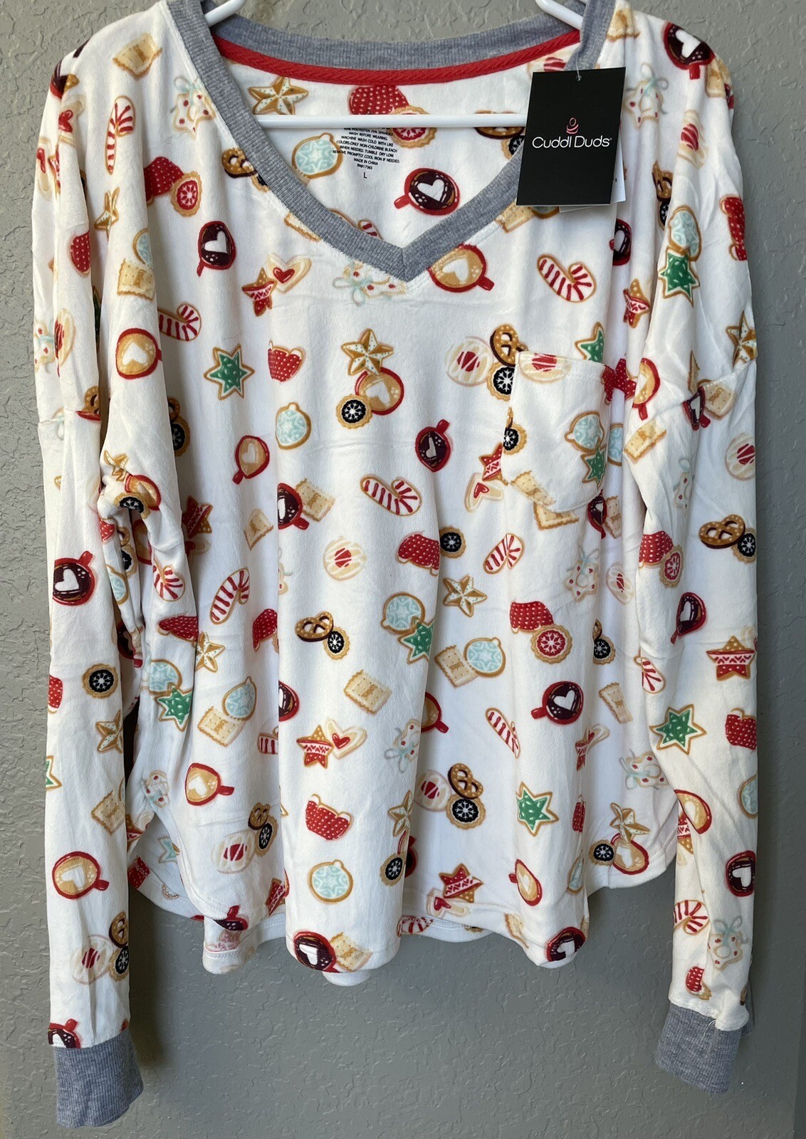 For sale is a women's NWT Cuddl Duds Velour Fleece pajama top, size L. Drift off to sweeter dreams when you wear this women's Cuddl Duds pajama top. FEATURES Top Crystal fleece Chest pocket and two side seam pockets Rounded hem No closure - pull-on styling Ribbed cuffs Drop-shoulder sleeves Long sleeves Unlined Tag free V-neck It is machine washable and comes from a smoke free home. Approximate measurements are in inches lying flat: Size: L Chest, arm pit to arm pit: 24" wide Sleeve length from top of shoulder: 25" long Length, from top of shoulder to the bottom hem: 25" long I would be happy to send additional photos and answer any questions prior to all bidding. Please know your size, as all sales are final. I do not offer refunds for items that do not fit. There are no returns unless there was error in the listing. Payment is due within 5 days and I accept PayPal only. Shipping rates are for the U.S. only. Please inquire about international shipping rates. I ship USPS - either Priority or First Class. I would be happy to combine shipping charges if multiple items are purchased. I understand that mistakes do happen. Please communicate with me ahead of time so that you receive an item that you are happy with. If there is a problem with your item or payment, please contact me immediately so that I may have the opportunity to correct the situation. Customer Satisfaction is my # 1 priority! I value your positive feedback and 5 Star rating. Thank You!!
