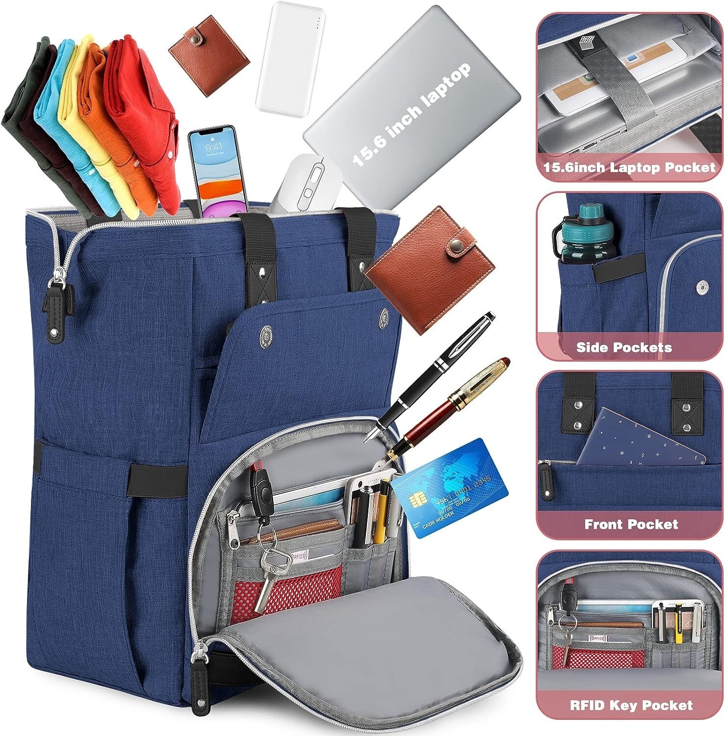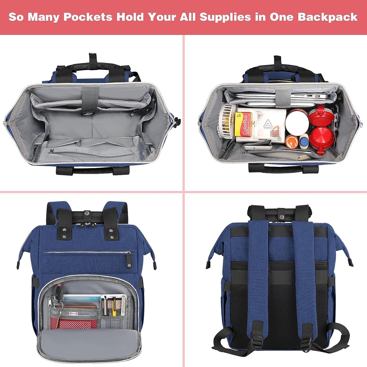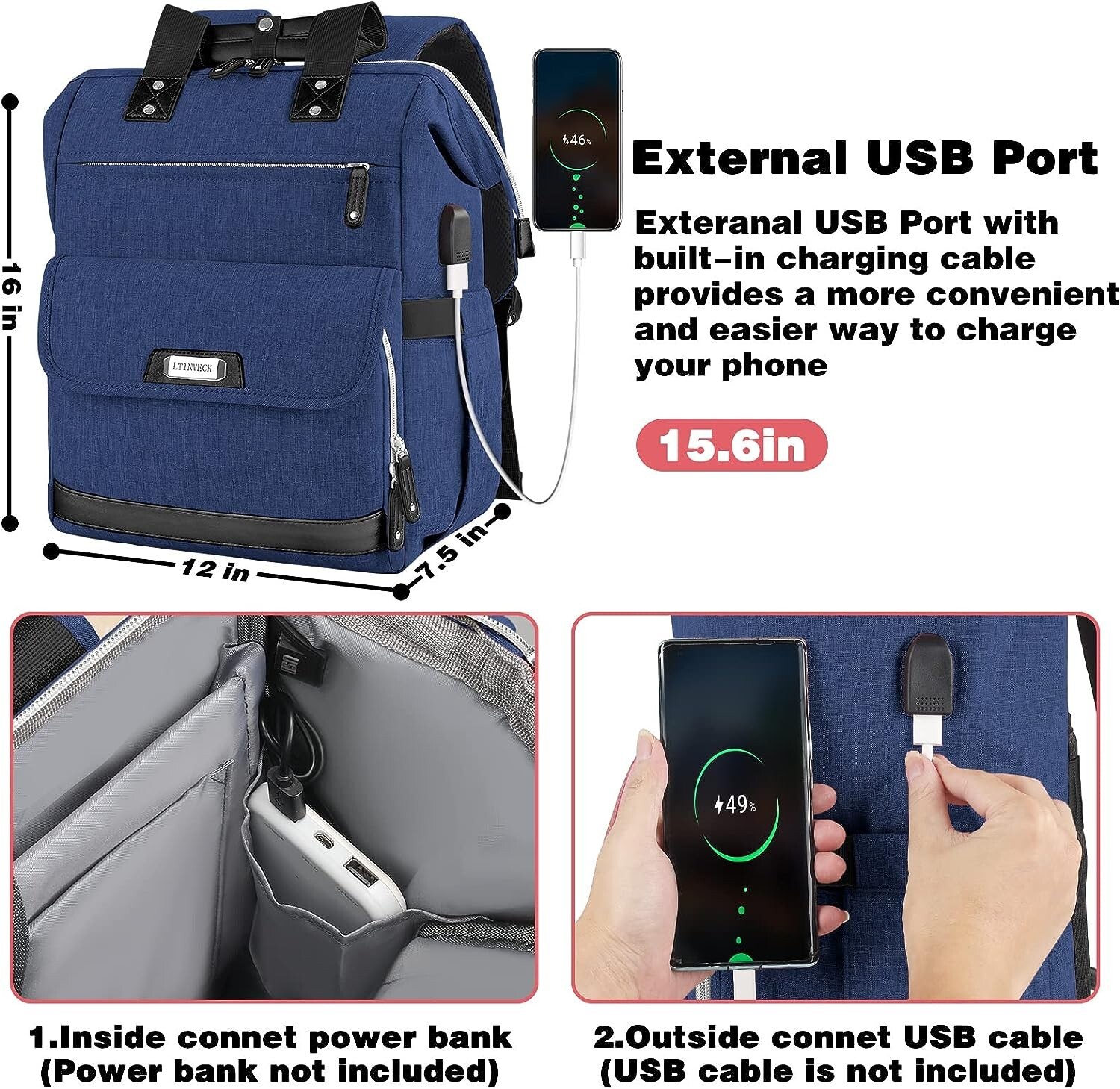 Laptop Backpack for Women Holds a Laptop up to 15.6'' Wide Open Top with USB Charging Port Measures 12'' x 8'' x 16'' Blue with grey inside, Made of Polyester, Multiple Pockets New No Original Packaging