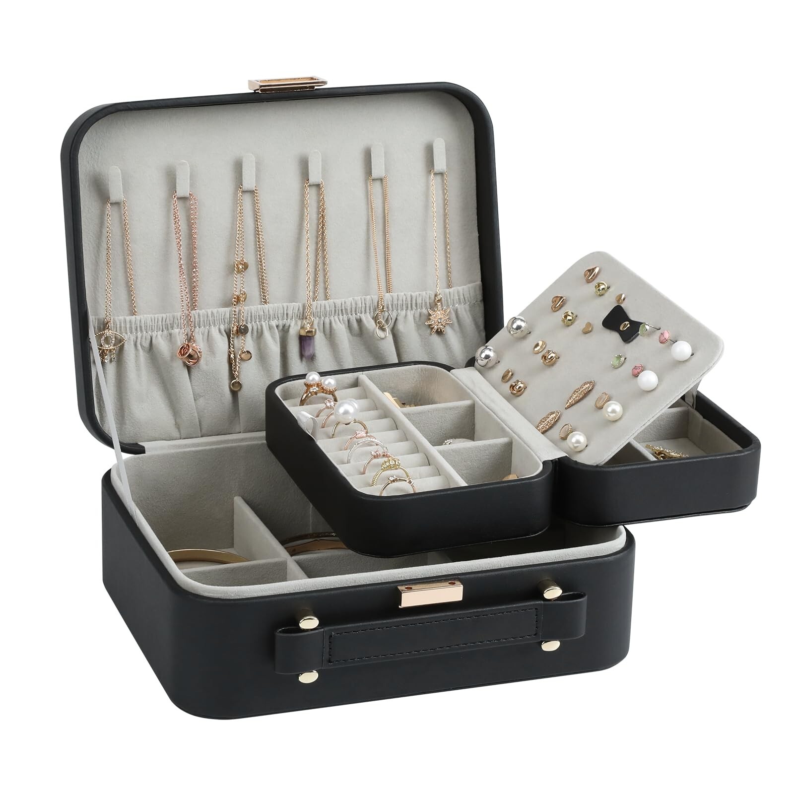 Jewelry Box for Women, Travel Jewelry Organizer Case with Jewelry Tray for Rings Earrings Necklaces Bracelets Watches, Black Product Details Color: A Fashion Black Brand: V-LAFUY MPN: JB0707 UPC: Does not apply EAN: Does not apply Color: A Fashion Black Brand: V-LAFUY Material: Leather Style: Modern Special Feature: Portable, Removable, Lockable, Adjustable Recommended Uses For Product: Ring Product Dimensions: 9.25"D x 7.4"W x 3.42"H Target Audience: Women Shape: Rectangular Finish Type: Polished or Lacquered or Painted Color: A Fashion Black Brand: V-LAFUY Material: Leather Style: Modern Special Feature: Portable, Removable, Lockable, Adjustable Recommended Uses For Product: Ring Product Dimensions: 9.25"D x 7.4"W x 3.42"H Target Audience: Women Shape: Rectangular Finish Type: Polished or Lacquered or Painted Inner Material: Velvet Number of Drawers: 1 Number of Compartments: 2 Jewelry Storage Type: Jewelry Box Number of Items: 1 Manufacturer: V-LAFUY Occasion: Wedding, New Home, Thanksgiving, Memorial Day, Valentine's Day Mounting Type: Freestanding Closure Type: Zipper Item Weight: 2.27 pounds Country of Origin: China Item model number: JB0707 Finish: Polished or Lacquered or Painted Special Features: Portable, Removable, Lockable, Adjustable Included Components: Body Batteries Included?: No Batteries Required?: No Date First Available: August 3, 2024 Large travel jewelry box and tray have removable dividers at the bottom. You can resize the compartments by removing internal dividers to create large volumes and different layouts. Large-capacity size (9.25" x 7.4" x 3.42"). 2-layer stackable large jewelry travel organizer is designed for organizing all types of jewelry. Whether the rings, earrings, necklaces, bracelets, watches, etc. Ensure all your most loved jewelry is well organized and ready to wear. Jewelry box with handle design is different from ordinary jewelry boxes. Easy to carry them to occasions such as travel or performances. The removable tray is also a travel jewelry box, which is functional and compact enough to carry in a bag or luggage. Large travel jewelry case with a diamond shape on the top shows a high-level tridimensional sense. Use durable PU leather and soft velvet lining. Perfect for protecting your beloved jewelry from scratches and damage. Best Gifts for Women. Whether you are treating yourself or giving a gift to your girlfriend, wife, mother, or other loves for Birthday, Christmas, Anniversary Day, or Wedding. V-Lafuy jewelry boxes for women are an ideal choice.