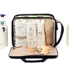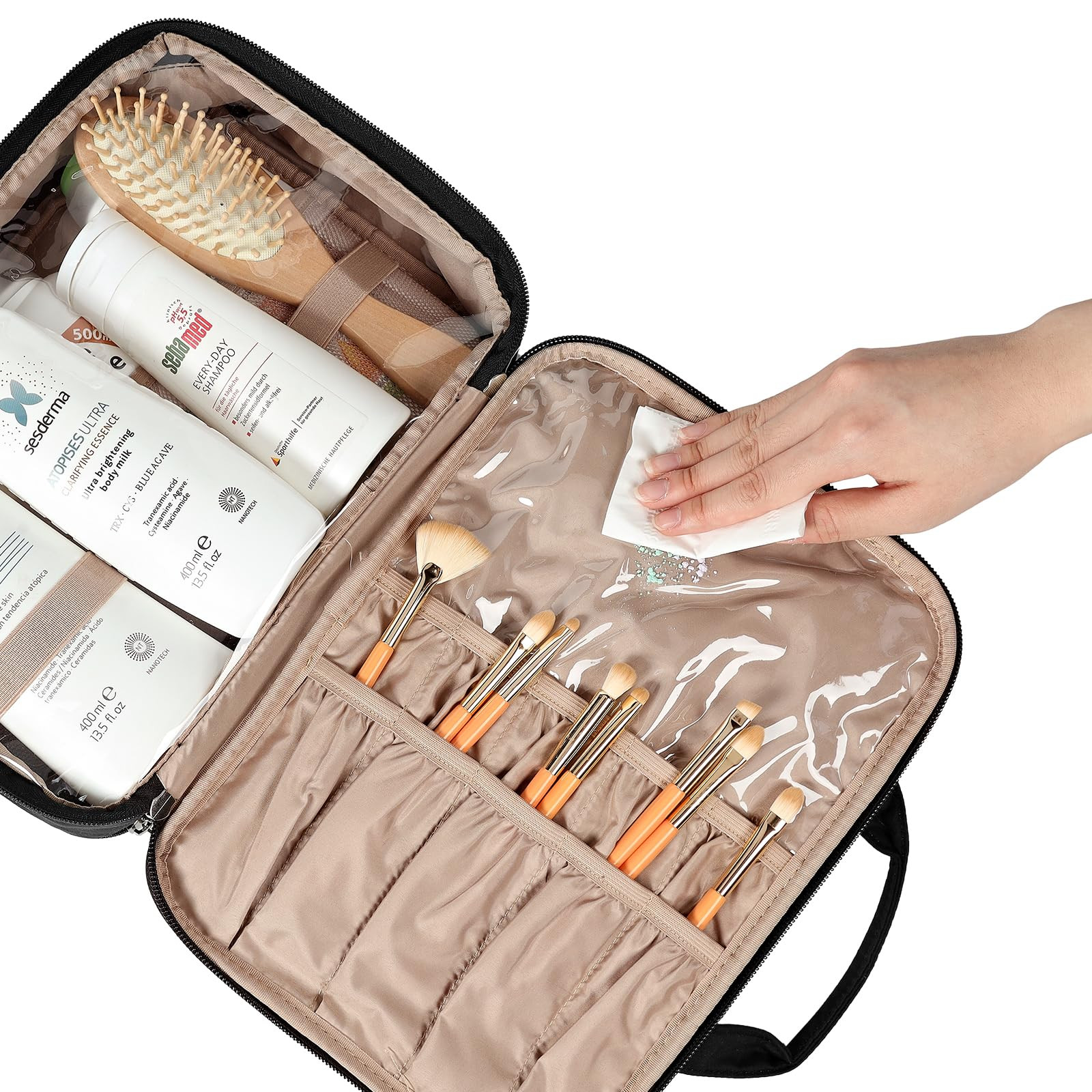 SPACIOUS CAPACITY - 12 x 4.5 x 9 inches, The space-efficient hanging toiletry bag can hold all your travel essentials: full-sized shampoo, Conditioner, and Skin care products STAND DESIGN - Fully openable on both sides with a vertical layout, allowing cosmetics to stand upright in the central compartment for easy organization and access MULTIFUNCTIONAL COMPARTMENTS - Fully open with transparent design that gives you a comprehensive glimpse of your stuff. Different compartments keep your toiletries and in place, and a front zipper pocket provides additional storage with convenience VISIBLE & CLEANLY - Transparent compartment design for easy access to all items, while the inner PVC material is easy to clean, ensuring your toiletries stay neat and tidy SOFT & LIGHTWEIGHT MATERIEAL - The outside material of the toiletry bag is soft to the touch and lightweight. You can pack this reasonably flat if you don't pack too much stuff, making it more suitable for travel. Definitely an ideal Christmas gift for yourself, your family, and your friend