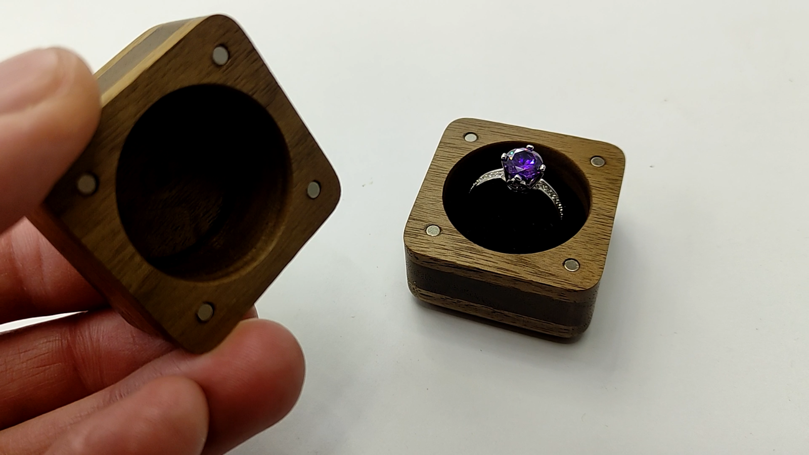 This wood engagement ring holder is made from walnut. The proposal box is small, the lid is held firmly by magnets in 4 corners. The wooden box is very high quality sanded and polished with wax, it is very pleasant in the hand. The box can be engraved with your names, initials, text or picture and will be great personalized gift.Ideal wood for engraving. The ring stands on a black suede pillow. You can also choose moss or red pillow. I can make a pillow with slots for 2 rings. Size: high - 40 mm. wide - 40 mm. deep - 40 mm. Inside diameter - 30 mm. Ring height max - 35mm. Laser engraving +4$