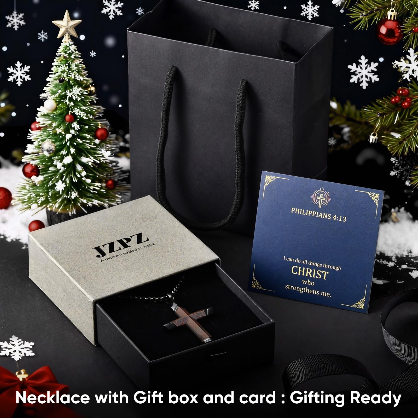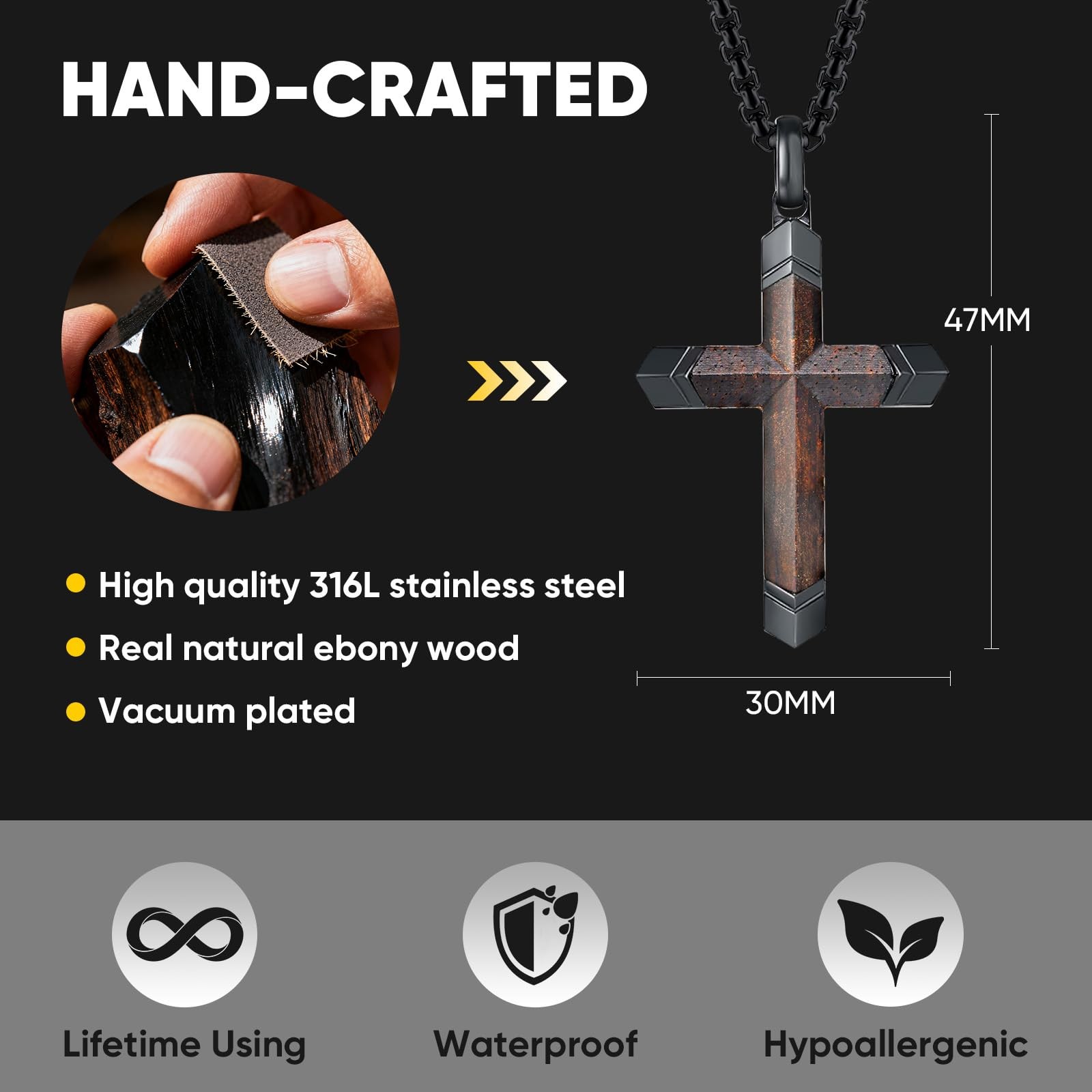 Discover the perfect blend of natural elegance and modern comfort with our cross necklace for men. This distinctive piece features a lightweight ebony wooden cross front, carefully paired with a smooth 316L stainless steel back—a unique design that ensures superior comfort against your skin compared to all-wood pendants. Built for daily wear, this stainless steel cross necklace for men is durable, fade-resistant, and hypoallergenic. The cross pendant measures 1.18" x 1.85", offering a balanced presence without being overly heavy. It hangs from a 24'' box chain—a versatile length that suits most men and allows for easy putting on and taking off. Faith-Inspired Design:Plain, simple, and classic cross necklace for men. This piece can serve as a reverent catholic cross necklace or a powerful jesus cross necklace, designed for those who value spiritual expression.Presented in a box, this mens cross pendant is ready to become a treasured gift. Why This Wood Cross Necklace Stands Out: Feel the difference of a cross necklace designed for daily life. We've fused a natural lightweight ebony wood front with a high-comfort 316L stainless steel back. Compared with the common wooden cross pendant, it is not only retains the natural essence of the wood but the cross will be more comfortable to wear as its smooth steel back rests comfortably against your skin Features of This Well-made Mens Cross Necklace: The crossing pendant necklace is durable, fade-resistant, hypoallergenic,resistant to breakage&maintains its shine over time. The perfectly sized cross pendant (1.18" x 1.85") hangs from a sturdy 24-inch chain. This length is universally flattering for most men, offering a comfortable fit that's long enough for easy wear and removal, ensuring all-day comfort Men's Wooden Cross Pendant Necklaces: Strength for Anything: The silver/ black/ gold plated stainless steel cross necklace includes a card with Philippians 4:13, a powerful bible verse that reminds us we can overcome all things through Christ who strengthens us, making this necklace a continuous source of empowerment and inspiration for yourself or as a meaningful gift. Whether dressing up for a special event or adding a touch of elegance to day outfit, this necklace is a versatile addition Perfect Christmas Cross Necklace Gift for Any Occasion: Presented in an elegant box, ready for gifting! Treat yourself or give as a Spiritual Presents, this is an amazing daily religious cross gift for every important man like your husband, boyfriend, father, son, grandson, nephew or friends. The men's cross necklace Classic Men's Christian Cross Necklace with Cross: We stand behind the quality of our high-quality stainless steel cross pendant necklace. Since each wood cross is cut from a unique piece of ebony, the color and grain patterns will vary slightly from piece to piece, making your necklace a one-of-a-kind testament to your faith. Thank you for your understand! You're important to us~should you have any questions for the jesus cross necklace, please do not hesitate to contact, we will help ASAP