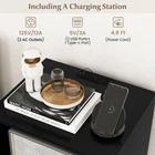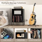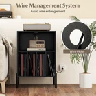 Color: Black Material: MDF, Metal, Engineered Wood Overall Dimensions: 21'' x 18'' x 31'' (L x W x H) Middle Open Shelf Dimensions: 20'' x 10'' x 17''(L x W x D) Long Shelves Dimensions: 13'' x 4.5'' x 17'' (L x W x D) Ground Clearance: 6'' Length of Power Cord: 4.9 Ft 2 AC Outlet Voltage: 125V/12A 2 USB Ports & 1 Type-c Voltage: 5V/3A Net Weight: 39.5 lbs Weight Capacity of Countertop: 110 lbs Weight Capacity of Middle Shelf: 66 lbs Weight Capacity of Each Long Shelf: 22 lbs Accommodate Vinyl Record Number: 150 Package Includes: 1 x Turntable Stand 1 x User Guide Elevate the style of your room with this modern turntable stand! This 3-tier record player display shelf features a spacious tabletop, a large middle shelf and 4 divided storage compartments, offering ample space for your vinyl records and books. Additionally, there is a built-in charging station to keep your devices powered. The wire management system on the back keeps your messy cords neatly organized. Moreover, the vinyl record stand comes with anti-toppling kits and sturdy metal legs for added stability. You can clean the record player shelf effortlessly due to its smooth and waterproof surface. Finally, whether in the living room, bedroom or office, this turntable stand can add functionality and aesthetics. Features: A large tabletop and 5 compartments hold many items Includes a charging station with 2 AC outlets, 2 USB ports and a Type-c port Ample storage space for up to 150 vinyl records Color: Black Material: MDF, Metal, Engineered Wood Overall Dimensions: 21'' x 18'' x 31'' (L x W x H) Middle Open Shelf Dimensions: 20'' x 10'' x 17''(L x W x D) Long Shelves Dimensions: 13'' x 4.5'' x 17'' (L x W x D) Ground Clearance: 6'' Length of Power Cord: 4.9 Ft 2 AC Outlet Voltage: 125V/12A 2 USB Ports & 1 Type-c Voltage: 5V/3A Net Weight: 39.5 lbs Weight Capacity of Countertop: 110 lbs Weight Capacity of Middle Shelf: 66 lbs Weight Capacity of Each Long Shelf: 22 lbs Accommodate Vinyl Record Number: 150 Package Includes: 1 x Turntable Stand 1 x User Guide