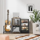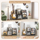 Record Player Stand: The record player stand with vinyl storage can hold up to 200 vinyl records. The 3-tier record display stand is a stylish way to display your vinyl records and also at an easy access to pick from your collection. You no longer need to store your records in inaccessible cabinets. The top level of record player table dimensions: 15.35”(L) x 11.81” (W). ALL IN ONE: The stand combines the functions of record player stand, vinyl record display stand, and guitar stand. This multi-functional design efficiently utilizes limited space to accommodate both storage and display of records and guitars. Record Player Stand: The vinyl holder can hold up to 200 vinyl records. The 3-tier record display stand is a stylish way to display your vinyl records and also at an easy access to pick from your collection. You no longer need to store your records in inaccessible cabinets. The top level of turntable stand dimensions: 15.35”(L) x 11.81” (W). Guitar Stand: The guitar stands floor that can store 2 guitars is suitable for storing acoustic, electric guitar, bass, ukulele, mandolin and banjo. The double guitar stand with storage shelf provides you with a place to store your guitar accessories and amplifier. The multi guitar stand keeps your guitar upright and protects it from touching the floor or wall. Guitar stand width: 5.11 IN. High Quality Materials: The record stand is equipped with adjustable foot pads to ensure stability on uneven surfaces. The record player stand with guitar stand made from high-quality materials like thickened wooden board, sturdy iron components, soft Oxford fabric, and rubber-covered guitar holder. The vinyl record holder offers a safe, stable, and durable storage solution for your guitars and albums. Easy to Assemble: The vinyl record stand with guitar stand combines modern style and retro style. It blends nicely with any style furniture you have. The album storage for vinyl records is an ideal gift for your family or friends who are guitar or record lover! Thick packaging protects every part of the record player stand with guitar holder. Detailed instruction is included in the package, which makes the assembly was a breeze. Product dimensions: 49.21"(L) x 29.13"(H) x 11.81"(W)