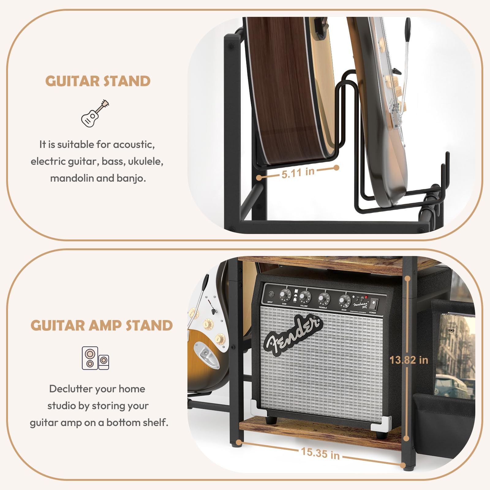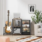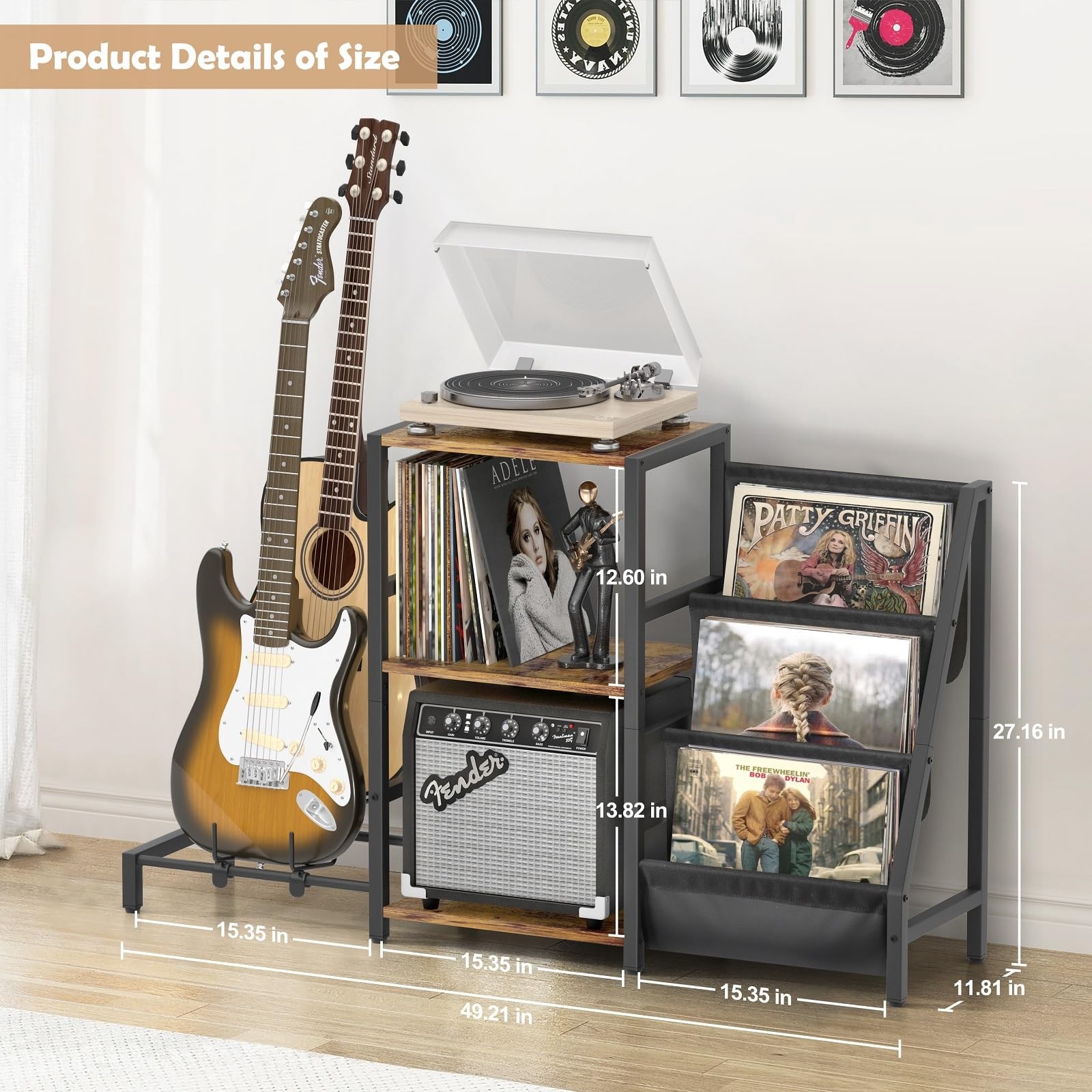 Record Player Stand: The record player stand with vinyl storage can hold up to 200 vinyl records. The 3-tier record display stand is a stylish way to display your vinyl records and also at an easy access to pick from your collection. You no longer need to your records in inaccessible cabinets. The top level of record player table dimensions: 15.35”(L) x 11.81” (W). ALL IN ONE: The stand combines the functions of record player stand, vinyl record display stand, and guitar stand. This multi-functional design efficiently utilizes limited space to accommodate both storage and display of records and guitars. Record Player Stand: The vinyl holder can hold up to 200 vinyl records. The 3-tier record display stand is a stylish way to display your vinyl records and also at an easy access to pick from your collection. You no longer need to your records in inaccessible cabinets. The top level of turntable stand dimensions: 15.35”(L) x 11.81” (W). Guitar Stand: The guitar stands floor that can 2 guitars is suitable for storing acoustic, electric guitar, bass, ukulele, mandolin and banjo. The double guitar stand with storage shelf provides you with a place to your guitar accessories and amplifier. The multi guitar stand keeps your guitar upright and protects it from touching the floor or wall. Guitar stand width: 5.11 IN. High Quality Materials: The record stand is equipped with adjustable foot pads to ensure stability on uneven surfaces. The record player stand with guitar stand made from high-quality materials like thickened wooden board, sturdy iron components, soft Oxford fabric, and rubber-covered guitar holder. The vinyl record holder offers a safe, stable, and durable storage solution for your guitars and albums. Easy to Assemble: The vinyl record stand with guitar stand combines modern style and retro style. It blends nicely with any style furniture you have. The album storage for vinyl records is an ideal gift for your family or friends who are guitar or record lover! Thick packaging protects every part of the record player stand with guitar holder. Detailed instruction is included in the package, which makes the assembly was a breeze. Product dimensions: 49.21"(L) x 29.13"(H) x 11.81"(W)