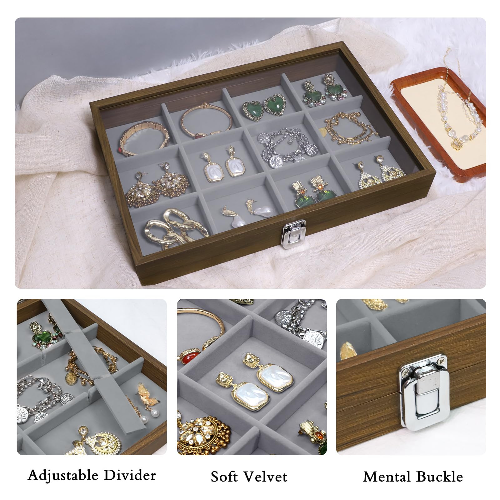 Material: This jewelry box is designed with a plush velvet lining that not only gives you a comfortable touch but also protects your jewelry from scratches and crushing so that your precious jewelry will be well cared. Size is 13.78" x 9.45" x 1.96"/35cm*24cm*5cm (L x W x H) Attractive and unique design: The golden bronzed hardware of this jewelry box is both beautiful and practical. The see-through lid enables you to easily locate your jewelry at a glance, making retrieval and storage convenient Large capacity: Features multiple compartments, drawers, and ring slots lined with soft velvet to keep your precious jewelry organized, tangle-free, and well-protected. It is suitable for organizing various jewelry including sunglasses, watches, hairpins, earrings, rings, bracelets, and necklaces Easy to Clean: A smooth surface and simple structure allow you to easily clean it with a wet cloth. In addition, The transparent lid provides excellent water and dust resistance for jewelry, which can effectively reduce your cleaning work Wide application: This jewelry box has a unique design with a vintage appearance and a large capacity with practical features. It is an ideal gift for Valentine's Day, Mother's Day, Thanksgiving, Christmas, birthdays, and weddings
