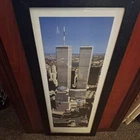 This framed commemorative photograph by James Blakeway captures the iconic World Trade Center Twin Towers in a large format print, measuring 43 1/2 x 17 inches with the frame. The image orientation is portrait, showcasing the intricate architecture in color on foam board material. This licensed reprint serves as a commemorative piece, paying tribute to the historical significance of the Twin Towers. The photograph is framed and produced using a photocopy technique, making it a valuable addition to any collection focusing on architectural photography. Frame has some kncks and dings. Also appears to have some paint specs on the side of the frame. Frame is overall in good condition picture is in great condition. The backing paper, or dust cover, has some moisture damage on the top. Photo itself seems to be in great condition with no signs of moisture whatsoever. This has an acrylic cover and there appears to be a few specs of debris underneath of it. Please see pictures for further detail.