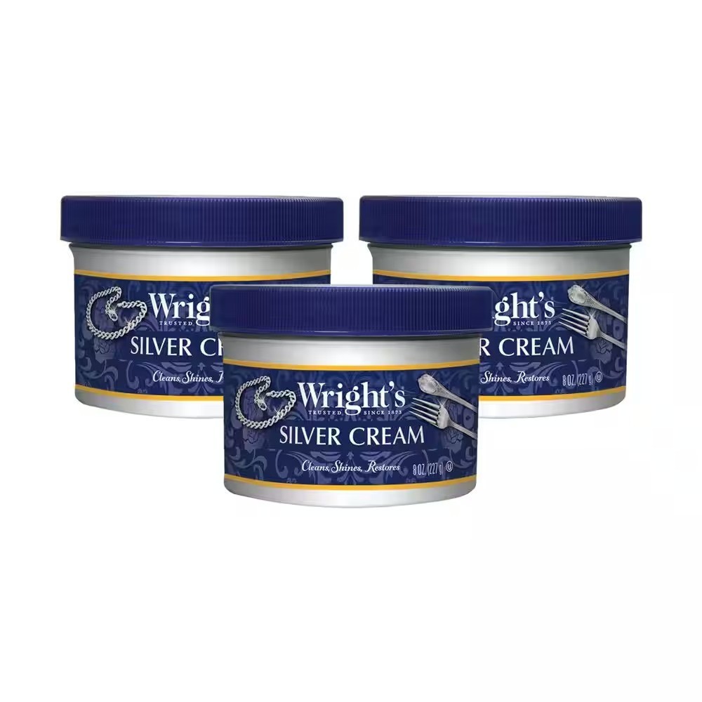 Wrights 8 oz. Silver Polish Cream (3-Pack) About This Product Give your silver the long-lasting shine and protection with the original gentle all-purpose Wright's Silver Cream. Made with only the finest ingredients and engineered with a mild non-scratch formula that instantly removes tarnish and polishes silver and other metals to restore natural color luster and shine. Anti-tarnish agents leaves a protective tarnish coating that prevents and delays tarnish from returning and keeps silver shining longer for years to come. Wright's Silver Polishing Cream is developed with a unique ammonia-free polishing cream formula that allows safe use on all types of silver including sterling silver silver plate silver jewelry fine antique silver flatware pewter stainless steel chrome porcelain and more. In addition to silver Wright's Silver Cream gently revitalizes motorcycle and auto chrome removes scratches from CDs and DVDs brightens golf clubs and revives most metals to leave an immense mirror-like shine. Instantly clean shine and restore dull discolored metal with the 3-in-1 all-purpose Wright's Silver Polish Cream. Wright's Metal Care is the perfect home chef pro scratch resistant cleansing household professional and at work solution for all of your silver cleaning and buffing needs. The best specialty cleaning products you will buy online or in a store. When cleaning is your therapy Wright's Metal Care is your method just wipe away and not a fingerprint in site. Highlights Long-lasting shine - the finest ingredients keep silver and other metals beautiful for many years to come Restore - rejuvenates dull and tarnished silver by removing tarnish and polishing to a brilliant shine Effective - a unique non-scratch formula brilliantly cleans shines and restores silver Protect - anti-tarnish formula leaves behind a protective coating that delays tarnish from reforming Dimensions Product Size 8 OZ-Ounce Details Concentrated or Ready to Use Ready to use Features No Additional Features Product Form Cream