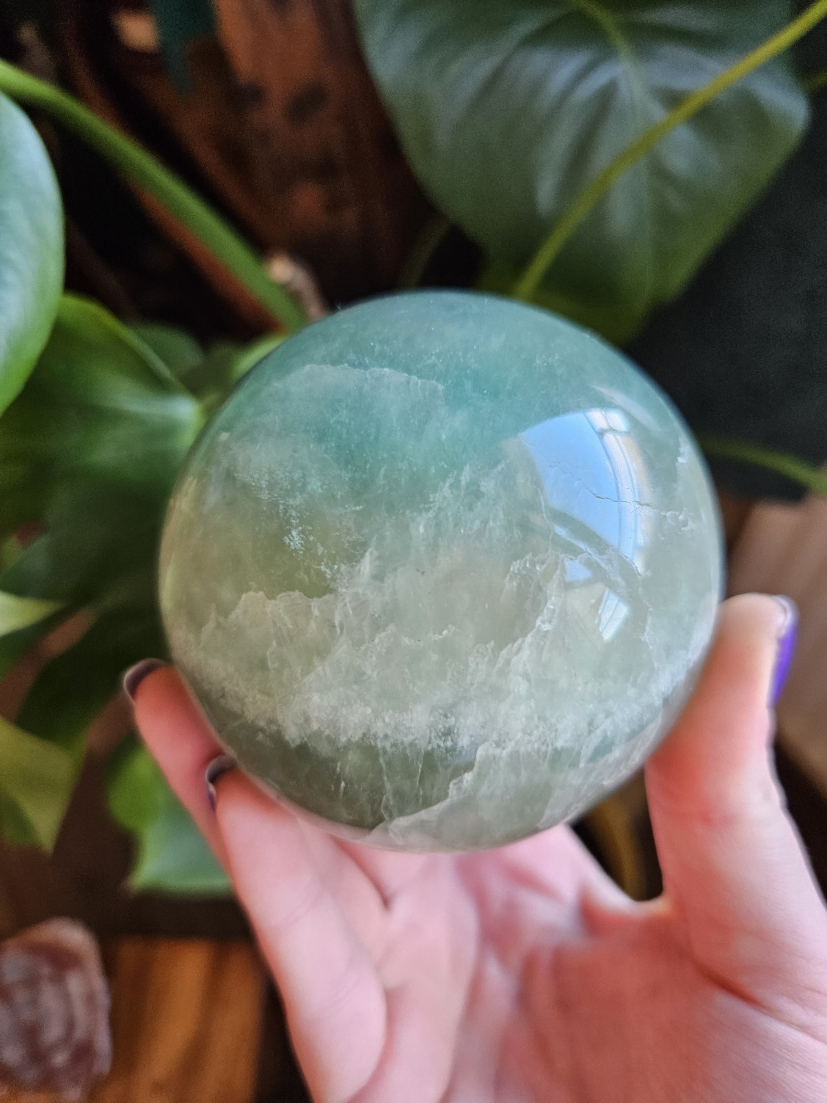 FLUORITE PLANET - C Large polished Green Fluorite crystal sphere 'planet'. Grade A quality. Handcarved and polished in Madagascar. Weight - 879g Size - 3.3" inch diameter You will receive the exact crystal pictured. Fluorite is a vibrant crystal with tropical and teal green with transparent tones and deep purple notes throughout. Fluorite is a crystallising mineral that forms within granitic pegmatites through hydrothermal activity. METAPHYSICAL PROPERTIES; • Personal & spiritual growth • Soothing & relaxing energy • Clarity & improves concentration • Purifies the soul • Understanding • Truth & honesty • Good communication • Banishes negativity ZODIAC SIGN; Pisces & Capricorn ELEMENT; Water & Earth PLANETS; Neptune & Saturn CHAKRA; Crown & Throat Chakra DISCLAIMER; Do not submerge in water, as the crystal may become damaged. Charge your crystals regularly with incense, sunlight and under the Full Moon. Crystals may have imperfections, this is a sign of authenticity.