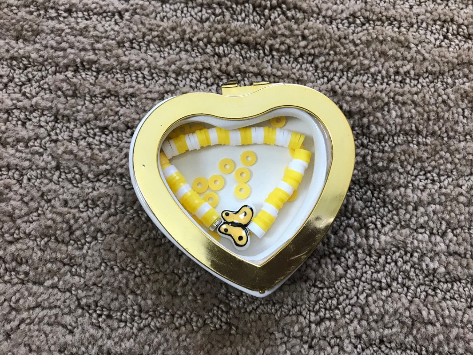 This adorable bracelet is perfect for tiny wrists! The cheerful yellow and white clay beads add a fun, textured touch while keeping it lightweight and comfortable. The neutral colors make it easy to match with any outfit, and the handmade feel gives it a special charm. Durable yet delicate, it’s ideal for kids or anyone who loves a playful, understated accessory. A great pick for everyday wear or gifting!