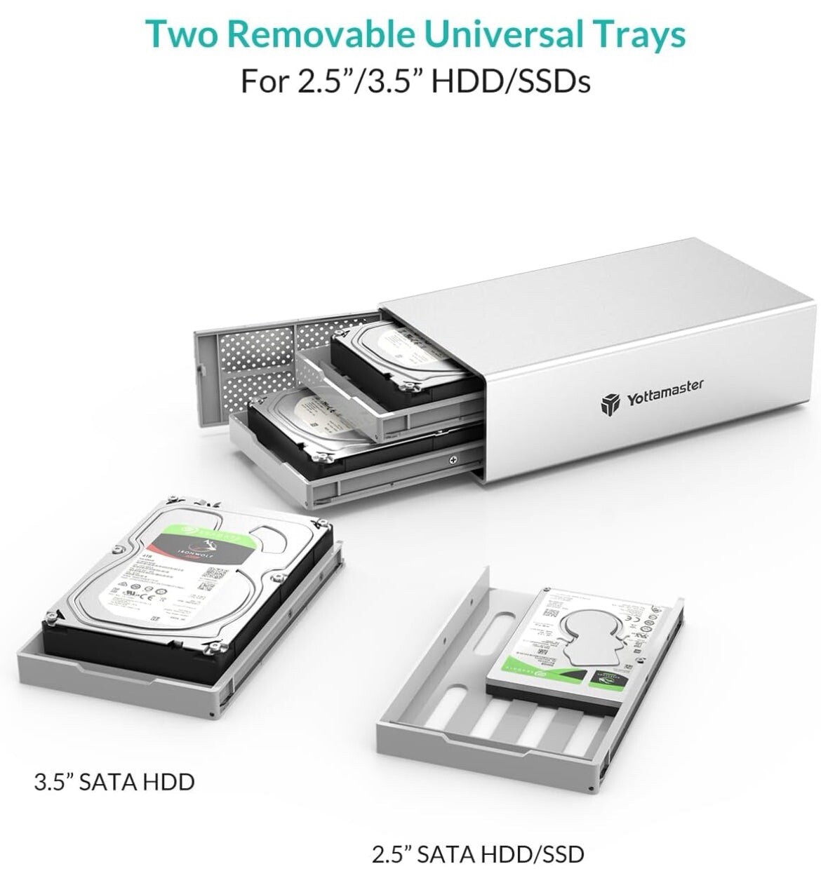 Yottamaster 2 Bay External Hard Drive Enclosure, Aluminum USB3.0 3.5" HDD Enclosure Versatile Compatibility and Larger Storage: Yottamaster 2 Bay Hard Drive Enclosure supports both HDDs and SSDs for up to 32TB of storage with 2 x 16TB drives. Giving you plenty of space to save your precious memories, images, videos, and important data files. Whether you're a busy professional or a casual user, this hard drive enclosure provides the speed, reliability, and security you need to keep your data safe and accessible at all times. Fast dat transfer with USB 3.1 to SATA 3.0 provides 5Gbps max data transfer rate; UASP protocol supported. Sturdy aluminum alloy enclosure that protects your drives. Designed with honeycomb heat dissipation holes. 12V/4A adapter included for stable power delivery and minimizing the risk of data loss. Simple plug and play setup with no drivers required. Widely compatible with Windows and Mac.