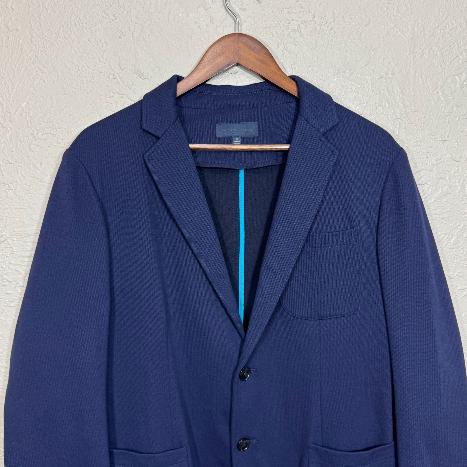 Zachary Prell Jacket M Sport Coat Unstructured Blazer Pique Knit Navy Preppy Ivy Brand: Zachary Prell Size: Men's medium Color: Navy blue in a pique cotton knit Features: Notched lapel, two button front, singled breasted, singled vented, patch pockets, satin sleeve lining, lightweight unstructured feel with a pique knit stretch fabric Material: 55% Polyester, 45% Cotton Country of Origin: Romania Style Name: Deconstructed Ocupu Tu Calle Condition: Item is in excellent preowned condition with no flaws. All purchases are shipped within one business day of purchase. Free returns are accepted for any reason within 30 days of purchase. Keywords: modern menswear, tailored casual, soft blazer, minimalist style, smart casual, normcore, contemporary fashion, elevated basics, city wear, preppy, old money, quiet luxury, designer, tech, stretch, contemporary, capsule, timeless, neutral, normcore