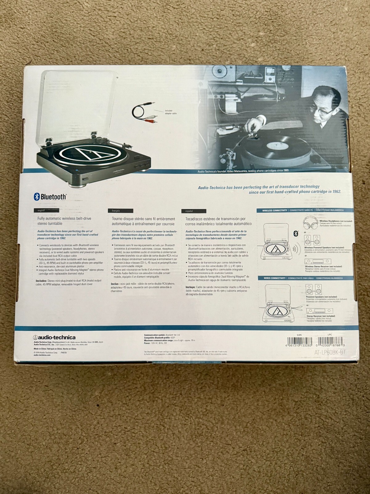 Audio-Technica AT-LP60BK-BT Wireless Belt-Drive Stereo Turntable - Black Enjoy the warm sound of vinyl with modern Bluetooth convenience. This Audio-Technica AT-LP60BK-BT turntable is a fully automatic, belt-drive model that plays 33 1/3 and 45 RPM records and pairs easily with Bluetooth speakers or headphones. Features a built-in switchable phono preamp and a sleek, space-saving design. Item has been opened but never used — in like-new condition. Includes all original accessories and packaging.