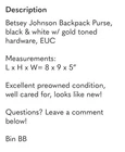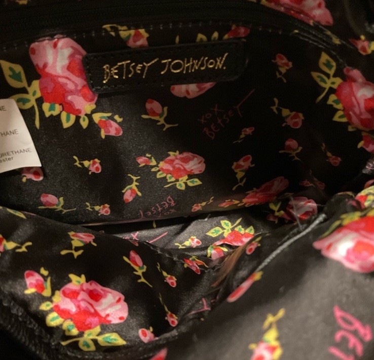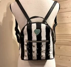The Betsey Johnson backpack purse is a stylish and practical accessory for women. Made from faux leather with a black and white striped pattern, this small backpack features studded accents and gold-plated hardware. It includes inner and outer pockets, an adjustable strap, and a zip closure. The top handle is white in color, adding a chic contrast to the overall design. Perfect for casual occasions, this backpack by Betsey Johnson combines fashion and functionality in one versatile piece. Interior is beautiful floral pattern & multicolored.