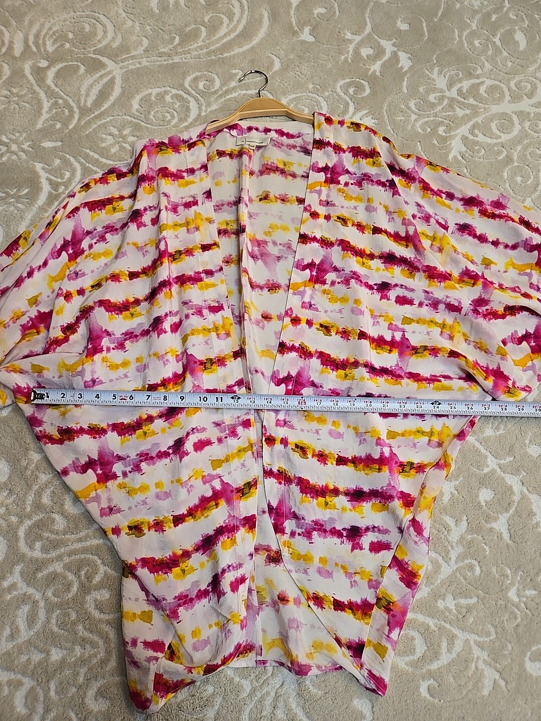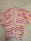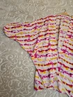 Elevate your wardrobe with this beautiful by Anthropologie Tie Dye Printed Cocoon Kimono Topper in Pink and Yellow. The 3/4 sleeves and open front neckline give it a relaxed fit, perfect for any occasion - whether it's casual, business or travel. The lightweight chiffon fabric makes it suitable for all seasons, and the pullover closure adds convenience. This blouse is machine washable and comes in one size, making it easy to wear and care for. The geometric pattern adds a touch of elegance to the kimono sleeve style topper. Made in India, this blouse is perfect for women who want to add a touch of style to their wardrobe. In excellent like new condition No visible flaws 100% Viscose Machine Wash Cold Super cute and stylish Gorgeous blouse Please see photos for measurements and details :)