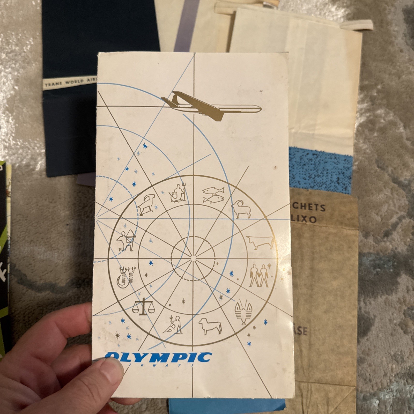 The product is a unique collection of vintage airline memorabilia, including maps, ticket jackets, and airsickness bags. These items offer a glimpse into the history and culture of air travel, providing a nostalgic look at the past. Perfect for aviation enthusiasts or collectors of vintage memorabilia, this assortment of airline-related items provides a tangible connection to a bygone era of travel.