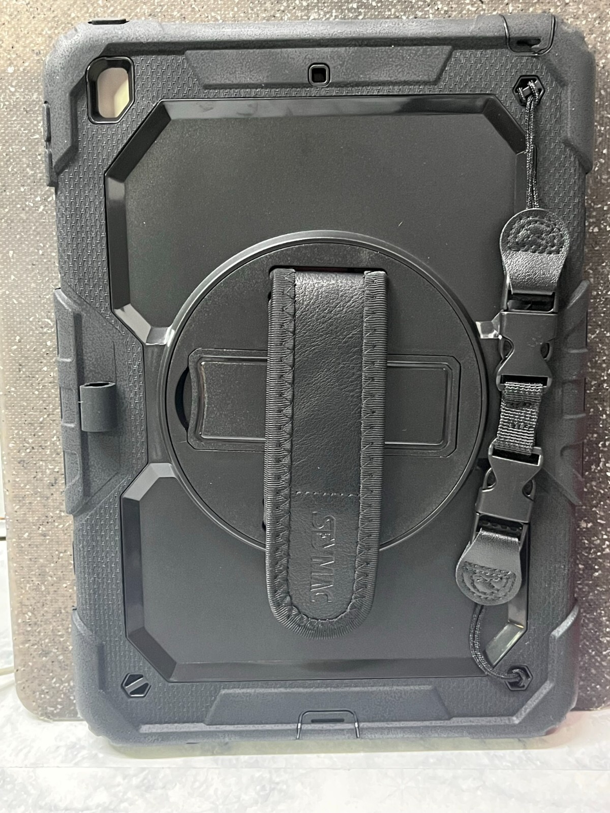 If you own an iPad 10.2" then this is a must-have protective case that you will absolutely love! Features include: * Built-in kickstand with a 360 degree rotation to support your tablet in both a horizontal or vertical position. * Built-in hand strap makes it easier to hold. * Adjustable, removable shoulder strap that allows you to display your tablet behind one car headrest for entertainment. * Built-in Apple Pencil holder. * Built-in Screen Protector * Black on Black design gives it a really sleek look. * BRAND NEW