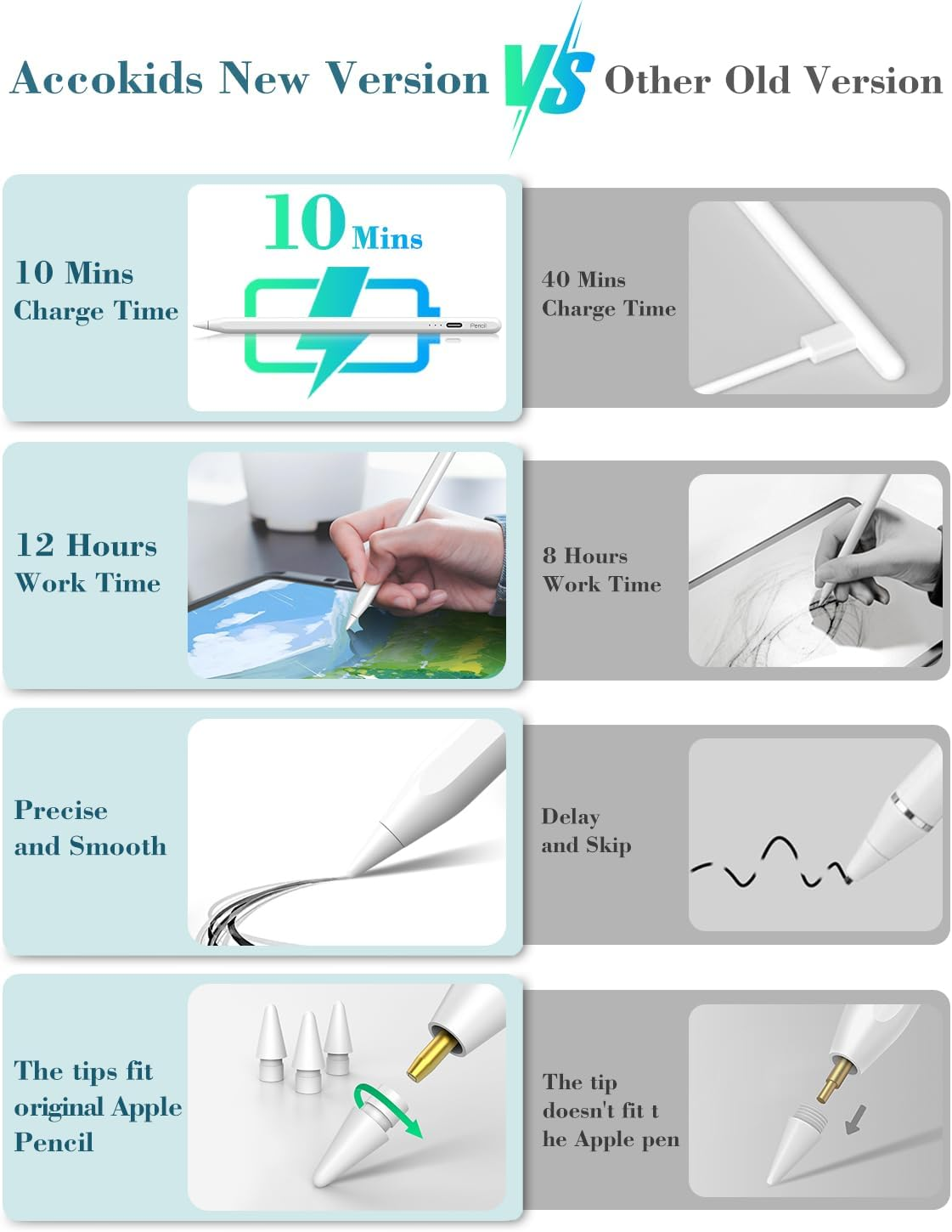 Store New Arrivals Add to Favorite View Feedback Contact Ipad Pencil 9Th&10Th Generation, 10 Mins Fast Charge Stylus Pen for Apple Pencil 1St/2Nd Ipad 6/7/8/9/10, Ipad Pro 11" and 12.9", Ipad Air 3/4/5, Ipad Mini 5/6 with Palm Rejection, Tilt Sensitivity Description Item dimensions L x W x H 6.61 x 0.55 x 0.55 inches Are Batteries Included Yes Color A-white Product Dimensions 6.61 x 0.55 x 0.55 inches Material Aluminum Country of Origin China Compatible Devices iPad Air 3/4/5, iPad Mini 5/6, iPad 6/7/8/9/10, iPad Pro 11" and 12.9" Item Weight 16 Grams Batteries 1 Lithium Polymer batteries required. (included) Batteries Required? Yes Charging Time 10 minutes Number of Batteries 1 Lithium Polymer batteries required. (included) Brand Accokids Manufacturer Accokids 【10 Mins Fast Charging & Long Usage Time】 The iPad pencil charges fully in just 10 minutes and allows 12 hours of continuous use with no need for a fast-charging adapter. When the stylus is inactive, it will automatically shut down after 10 minutes of inactivity, flashing during the final minute of sleep mode and reactivating upon pickup. 【Specialized for iPad 2018-2024】ONLY compatible with iPad 10th/9th/8th/7th/6th Gen, iPad Pro 11", iPad Pro 12.9" 6th/5th/4th/3rd Gen, iPad Mini 6th/5th Gen, iPad Air 5th/4th/3rd Gen. (**Please go to [Setting>General>About] to confirm your iPad's model name before placing order. NOT Compatible with other ipad models or any other brand touchscreen devices) 【Ultra-Responsive】This stylus with 1.5mm fine tip gives high sensitivity and accuracy, experience zero latency and no missed strokes, perfect for accurate drawing and writing. Also,the iPad pencil comes with 3 extra replacement tips, which fit original Apple Pencil( Other stylus tips can't) 【Support Palm Rejection & Tilt Sensitivity】No need to wear anti-friction gloves as you can rest your hand on the screen without worrying about accidental touches. The tilt-sensing technology allows you to draw lines of different thicknesses on the screen based on the angle of the iPad pencil. The combination of the two vital functions makes our writing and drawing more relaxed and free. 【Easy to Use】 PLEASE NOTE: This stylus doesn't have Bluetooth. Single press the top button of the stylus to turn on/off easily without connecting via Bluetooth. If you find it doesn't work after turning on, please turn off Bluetooth: Settings > Bluetooth > Turn off Bluetooth. To find extra replacement tips, please search ASIN: B0CXT112GZ on Amazon. 【Ideal Gift】 Three-light indicator displays battery level at a glance. Three lights on: 60%-100% power, two lights on: 20%-59% power, one light on: less than 20% power. With the exquisite packaging box, the stylus is a perfect Christmas gifts for artists, students, educators, business professionals, and everyday iPad users. Product Description The video showcases the product in use. The video guides you through product setup. The video compares multiple products. The video shows the product being unpacked. 1 Palm Rejection 2 Tilt Sensitivity 3 Magnetic Adsorption 4 Exquisite Packaging 5 3 Pack Replaceable Tips Please Note: This iPad pencil doesn't have Bluetooth. If your iPad pencil doesn't work after turning on, please follow these steps to disconnect the Bluetooth connection between your iPad and Apple Pencil : Settings > Bluetooth > Apple Pencil > tap "i" > Forget this device. ABOUT US We offer the best prices around on high quality products. Our E-store includes media such as books, movies, music and games while offering electronics, toys, sporting apparel, clothing, tools, general home, garden items and more. SHIPPING We are always working hard to ensure your package arrives as soon as possible. Please understand that some factors like weather, high postal traffic, and the performance of shipping companies are outside of our control. We offer free shipping to the lower 48 states and ship within 2 business days of payment, usually sooner. We do not accept P.O. Boxes. Please provide a physical address. RETURNS We offer a 30-Day Return Policy on items which you are not completely satisfied with. You have the option for a full-refund or an exchange of the item. No returns are available on items shipped outside of the USA. PAYMENT We accept PayPal. CONTACT US This page content is yet to come Please ad us to your favorite seller and visit again later Thank You CUSTOMER SATISFACTION We try our very best to make sure every customer is completely satisfied. If there's a problem, message us! We're happy to help.