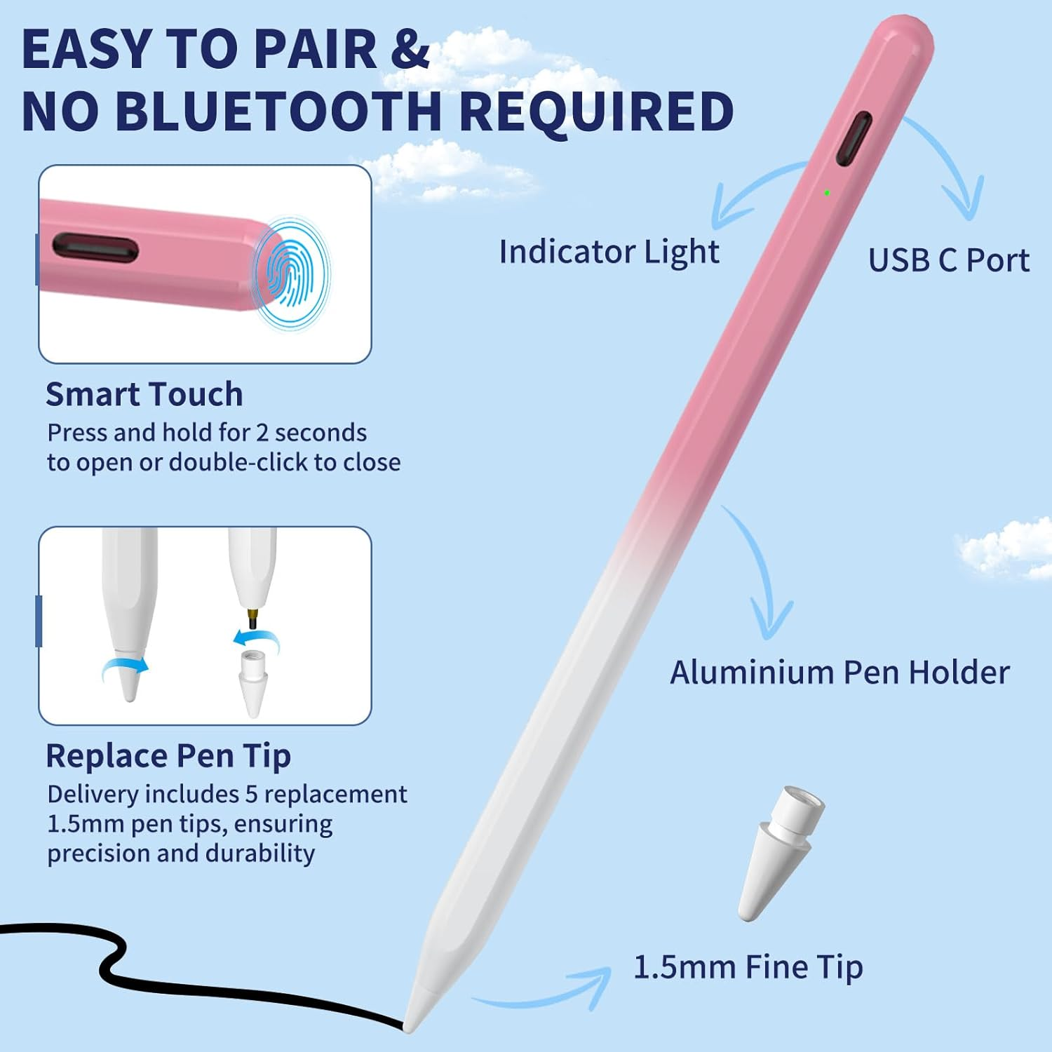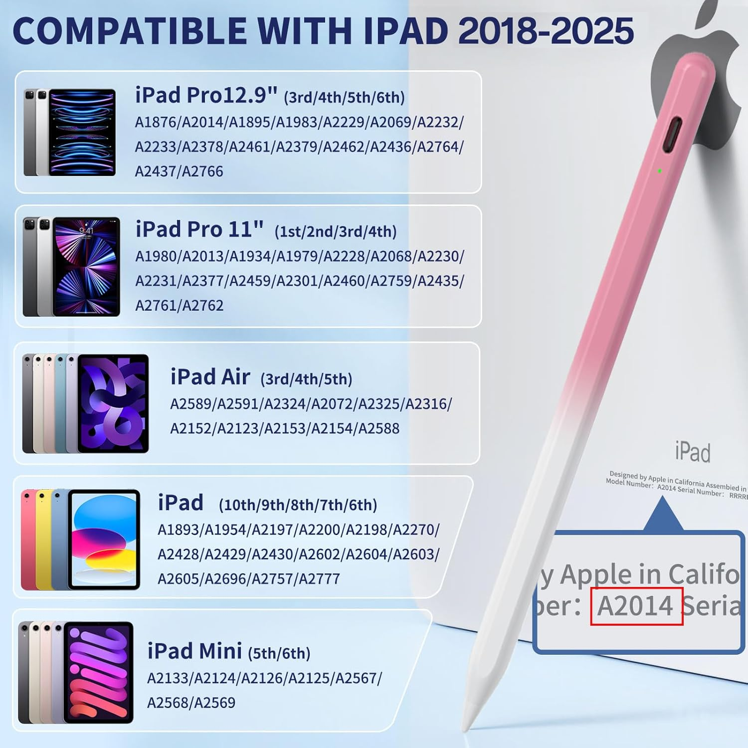 Ipad Pencil for 9Th & 10Th Generation, Fast Charge Stylus Pen for Palm Rejection and Tilt Sensitivity, Compatible with Ipad Pro 11/12.9In, Mini 5/6, Ipad 6/7/8/9/10, Air 3/4/5 (W/PK) [Compatible with 2018-2025 iPad Models Only] This is specifically designed for iPad models from 2018 to 2025, including iPad 9th/8th/7th/6th Gen, iPad Air 3rd/4th/5th Gen, iPad Pro 11 inches, iPad Pro 12.9 inches, iPad Mini 5th/6th Gen. Not valid for models prior to 2018, iPhone, Android, and Microsoft devices. Please verify the correct model before ordering [Pixel-Perfect Precision] Equipped with 5 replaceable 1.5mm tips boasting extremely high conductivity and wear resistance, our iPad pencil is ideal for coloring, sketching, note-taking, marking up PDFs, and more. No lag, no skips, no scratches [Tilt Sensitivity Function] The tilt-sensitive stylus pen for iPad allows you to draw lines of varying thickness and depth by changing the tilt of the pencil tip. Perfect for drawing and sketching, enabling you to express your creativity limitlessly [Palm Rejection Design & Magnetic Adsorption] Featuring upgraded palm rejection technology, our iPad stylus allows you to comfortably rest your palm on the screen while writing or drawing, without the need for gloves. Additionally, our iPad pencil comes with magnetic attachment, conveniently attaching to the side of the iPad when not in use [Long Battery Life] Charging in just 20 minutes, our pen for iPad lasts up to 10 hours. With a built-in smart power-saving device, it automatically enters "sleep mode" after 5 minutes of inactivity to save power Product Description Item model number 8032ff1d-419d-4ba7-ad08-7c190b1f2ce8 Batteries Required? Yes Are Batteries Included Yes Color W/PK Material Aluminum Country of Origin China Compatible Devices function(f) {var _np=(window.P._namespace("DetailPageProductOverviewTemplatesJava"));if(_np.guardFatal){_np.guardFatal(f)(_np);}else{f(_np);}}(function(P) { P.when('A').execute(function(A){ A.on('a:truncate:po-attribute-truncate-6:updated', function(data) { var isTruncated = !data.truncateInstance.getIfTextFits(); var seeMoreElement = document.getElementById('po-attribute-see-more-id-6'); if(seeMoreElement) { seeMoreElement.style.display = isTruncated ? '' : 'none'; } }) }); })); IPad (6. 7. 8. 9. 10. Generation), iPad Air (3. 4. 5. Generation), iPad Pro 12,9" (3. 4. 5. 6. Generation), iPad Pro 11"(1. 2. 3. 4. Generation), iPad mini (5. 6. Generation)IPad (6. 7. 8. 9. 10. Generation), iPad Air (3. 4. 5. Generation), iPad Pro 12,9" (3. 4. 5. 6. Generation), iPad Pro 11"(1. 2. 3. 4. Generation), iPad mini (5. 6. Generation) See more Item Weight 0.47 Ounces Batteries 1 A batteries required. (included) Battery Average Life Standby 10 Hours Charging Time 20 minutes Number of Batteries 1 A batteries required. (included) Package Dimensions 7.6 x 2.13 x 0.75 inches 2.13 inches x 7.6 inches x 0.75 inches. Weight: 0.47 oz Shipping from the USA All of our products are shipped from the USA, ensuring quick delivery to your destination. Payment We offer the following payment methods: PayPal, credit card, bank transfer, and eBay's secure payment system. Free Shipping & Free Returns Shipping within the USA is FREE. Additionally, any return is absolutely free for you. Risk-Free Purchase You have the option to return an item within 30 days without any justification. We cover the return shipping costs! Fast Shipping We ship immediately upon receipt of payment. Generally, the package is delivered within 2-3 days in the USA. If it takes longer, we will contact you. Quality and Costs Made in Europe, USA, China No customs fees or additional charges Total satisfaction guarantee Invoice with declared VAT available upon request in .pdf format Feedback Your feedback is very important to us. After you pay for your purchase, you will automatically receive positive feedback from us.
