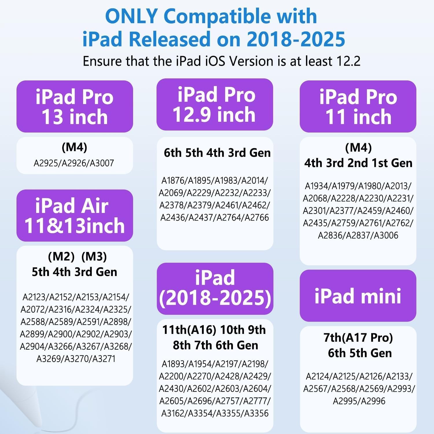 Product:iPad Stylus Pencil for Apple iPad 2018-2025 ipad pencil alternative ipad pencil pro alternative Input:5V-0.4A Material:Aluminum alloy Palm Rejection:Yes tilt sensitivity:Yes Bluetooth:No Pen head:Replaceable pen head The stylus pen is ONLY compatible with following iPad model number, please kindly check it before purchasing. iPad (6th Gen)-2018:A1893 / A1954 iPad (7th Gen)-2019:A2197 / A2200 / A2198 iPad (8th Gen)-2020:A2270 / A2428 / A2429 / A2430 iPad (9th Gen)-2021:A2602 / A2603 / A2604 / A2605 iPad (10th Gen)-2022:A2696 / A2757 / A2777 / A3162 iPad (11th Gen)(A16)-2025:A3354 / A3355 / A3356 iPad Mini (5th Gen)-2019:A2133 / A2124 / A2125 / A2126 iPad Mini (6th Gen)-2021:A2567 / A2568 / A2569 iPad Mini (7th Gen)(A17 Pro)-2024:A2993 / A2995 / A2996 iPad Air (3rd Gen)-2019:A2152 / A2123 / A2153 / A2154 iPad Air (4th Gen)-2020:A2316 / A2324 / A2325 / A2072 iPad Air (5th Gen)-2022:A2588 / A2589 / A2591 iPad Air (M2)-2024: 【13inch】A2898 / A2899 / A2900 【11inch】A2902 / A2903 / A2904 iPad Air (M3)-2025: 【13inch】A3268 / A3269 / A3271 【11inch】A3266 / A3267 / A3270 iPad Pro【11inch】-2018:A1980 / A2013 / A1934 / A1979 iPad Pro (3rd Gen)【12.9inch】-2018:A1876 / A2014 / A1895 / A1983 iPad Pro (4th Gen)【12.9inch】-2020:A2229 / A2069 / A2232 / A2233 iPad Pro (3rd Gen)【11inch】-2021:A2377 / A2459 / A2301 / A2460 iPad Pro (5th Gen)【12.9inch】-2021:A2378 / A2461 / A2379 / A2462 iPad Pro (4th Gen)【11inch】-2022:A2759 / A2761 / A2435 / A2762 iPad Pro (6th Gen)【12.9inch】-2022:A2436 / A2437 / A2764/ A2766 iPad Pro (M4)【11inch】-2024: A2836 / A2837 / A3006 iPad Pro (M4)【13inch】-2024: A2925 / A2926 / A3007 【5 Bonus Tips for iPad Pencil】Get 5 Replacement Nibs (Originally 3) – Free Upgrade!Enjoy 2 extra nibs at no cost with our stylus pen. 【LED Battery Percentage Indicator】The built in battery indicator uses actual percentages rather than a bar so you know exactly how much charge your stylus pen have left. Seeing the battery percentage on the side is helpful to you in making sure the stylus pencil is sufficiently charged. 【Strong Magnetic Attraction】You can snap the digital pen onto the iPad for quick storage, so you won’t forget it somewhere. *NOTE: The stylus pen does not support wireless charging on iPad. 【Effortless Palm Rejection Technology】Advanced palm rejection technology ensures that your creative flow remains uninterrupted, offering a paper-like experience. 【Tilt Sensitivity for Perfect Lines】You can effortlessly adjust line weight from thick to thin, ensuring every stroke on your iPad feels just right.*NOTE: The stylus pencil does not support Pressure Sensitivity. 【USB-C Port for Faster Charging】An included USB-C cable charges your stylus pen in as little as 25 minutes, providing longer hours of writing time of writing time. Automatic shutdown after 5 minutes of inactivity for efficient energy saving. 【Compatible with 2018-2025 Apple iPad】The iPad Pen is ONLY compatible with following iPad model number. iPad Pro 13inch (M4), iPad Pro 12.9inch(3rd/4th/5th/6th), iPad Pro 11inch(All Generations), iPad Air M3/M2/5th/4th/3rd Gen, iPad 11th(A16)/10th/9th/8th/7th/6th, iPad Mini 7th(A17 Pro)/6th/5th Gen.