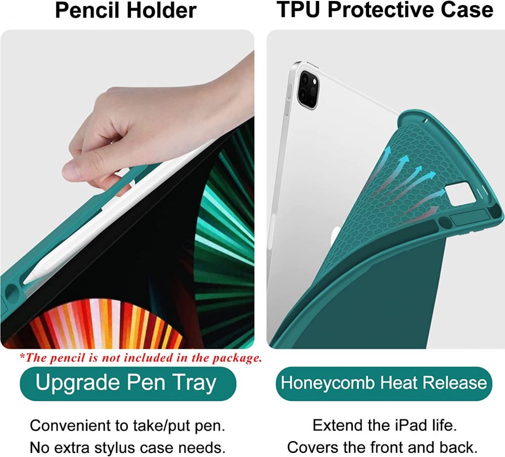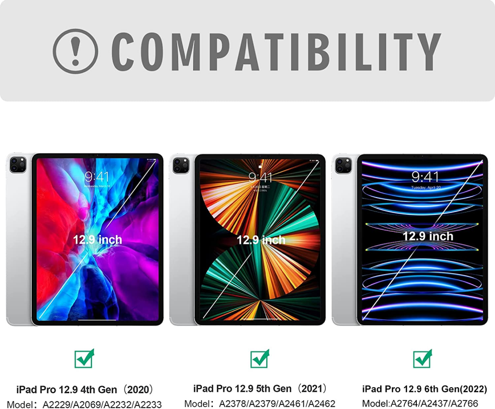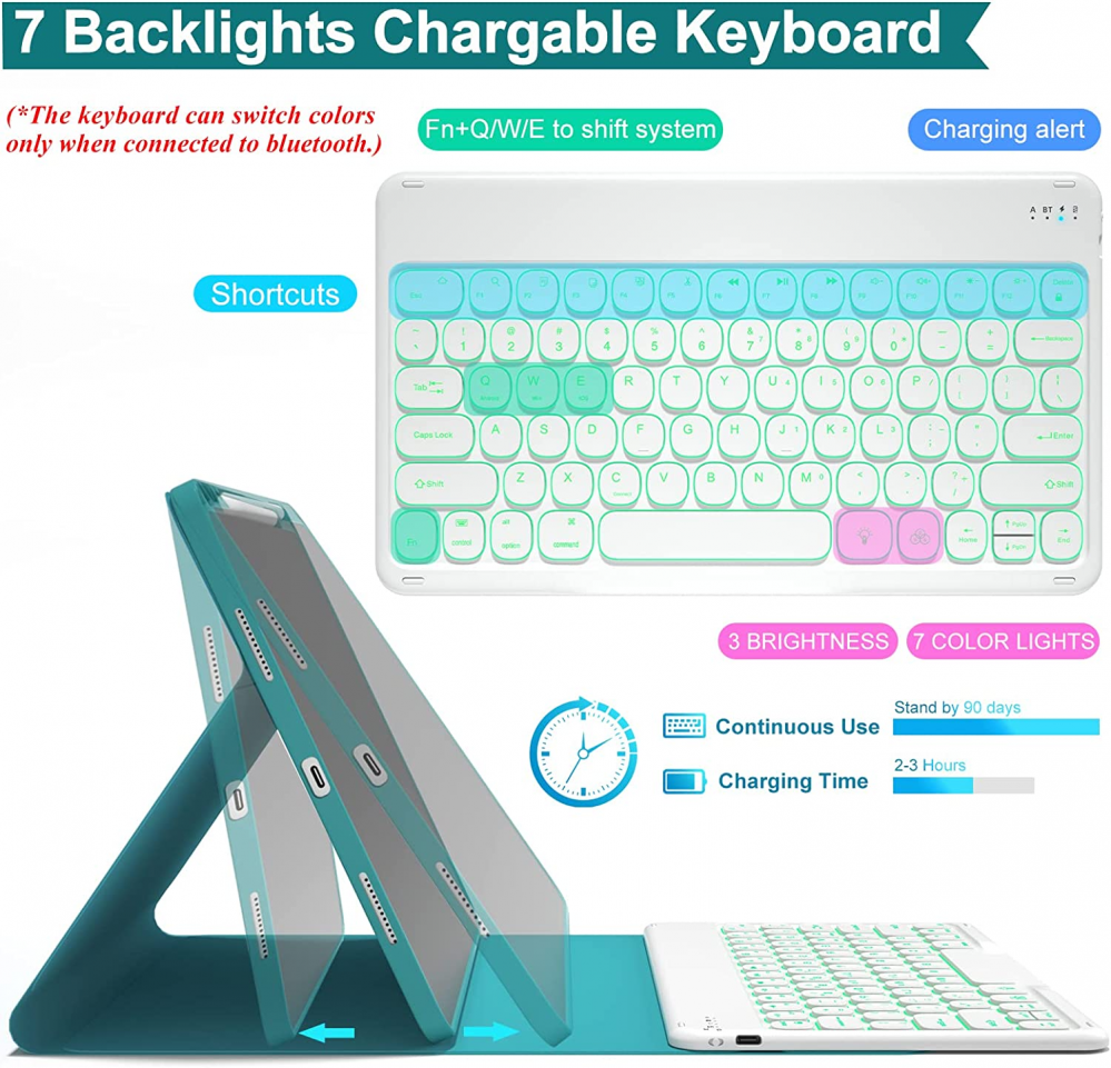 iPad Pro 12.9 inch Case For 4th/5th Gen, Teal for Product Details Product Dimensions: 11.3 x 9.37 x 0.59 inches Item Weight: 1.67 pounds Manufacturer: BLUTLOTUS Country of Origin: China Batteries: 1 Lithium Ion batteries required. (included) Brand: BLUTLOTUS Compatible Devices: iPad Pro 12.9 4th Generation 2020 (Model: A2229/A2069/A2232/A2233) Connectivity Technology: Bluetooth, USB Keyboard Description: Micro USB Special Feature: Backlit Color: Teal for 12.9 inch ✅【Keyboard Case for iPad Pro 12.9"】❗❗No pen or charge included!❗❗The Keyboard cover is designed for iPad Pro 12.9" 6th Gen 2022 (Model number: A2764/A2437/A2766),5th Gen 2021 (Model number: A2378/A2379/A2461/A2462),4th Gen 2020 (A2229/A2069/A2232/A2233).♐It's Not compatible with any other devices. Please check the model number of your iPad back bottom. ✅【Multiple Viewing Angles & Removeable Magnetic Keyboard】The flip leather case intends to combine tablet and keyboard which form a laptop with keyboard function to work easier. The smart folio keyboard and magnetic case allow us to adjust screen vision and typing position. Secure magentic closure enables you to take the tablet keyboard and a hard shell with you. In case you don't need the Bluetooth keyboard for your iPad sometimes, remove the keyboard and wear the iPad pro case. ✅【Colorful Backlit & Rechargeable Keyboard】Optional Backlight mode and 7 vibrant colors make typing fun and easy in the dark. Scissors mechanical keyboard feels quiet and smooth. The keyboard USB charge cables are attached with the parcel. After 2-3 hours of full charge, the wireless keyboard stands by for 90 days at once. ✅【Hybrid Shockproof Protective Cover & Auto Sleep/Wake Function】The protective case inner layer is of honeycomb grid pattern cushion that releases more 80% hotness than other iPad cases, prevent overheating to extend your iPad battery life and maximize screen protection. The smart cover puts your iPad sleep automatically when shut. ♐: To reach the best effection of sleep/wake-up, please take the keyboard off; cause the keyboard with iron may hinder the mutual attraction among the magnets.
