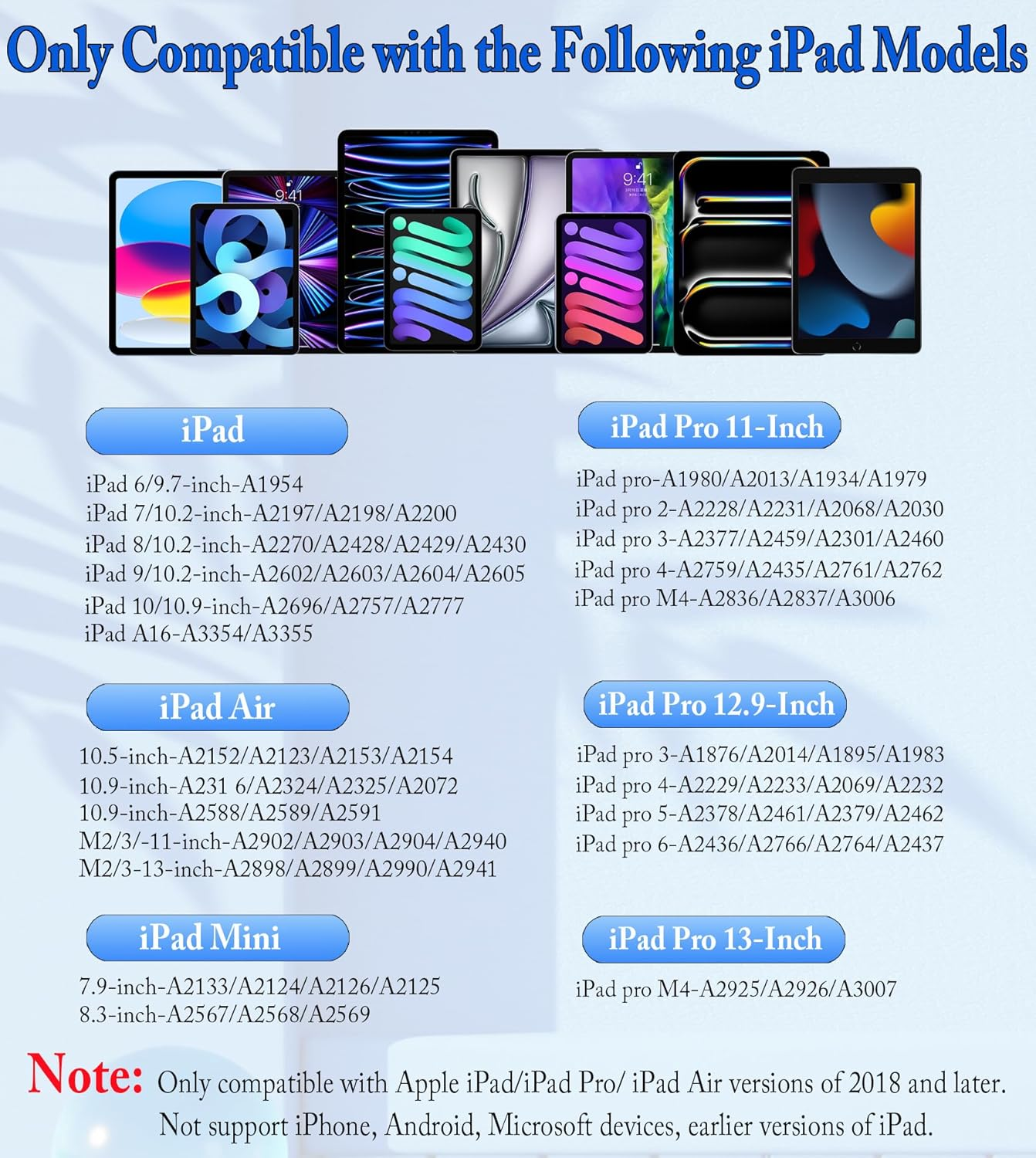 【Compatiblity of the iPad Pen】Note before purchase--This stylus pen ONLY compatible with Apple iPad 2018 - 2023 released models- iPad 6th/7th/8th/9th/10th Generation, iPad Air 4th/5th gen, iPad Pro 12.9-inch 3th/4th/5th/6th gen, iPad Pro 11-inch 1th/2th/3th/4th gen, iPad Mini 5th/6th Gen. NOTE: This smart pencil NOT support iPhone, Android, Microsoft devices, earlier versions of iPad 【Fast Charging & Long Battery Life】CMARS tablet pencil 2nd generation With USB-C charging port and built-in battery, just only takes 35 minutes to fully charge and lasts up to 8-hours usage.This for ipencil also features LED indicators to show the remaining battery power and charging progress, and this smart pen for iPad can standby for 65 days (Charged by USB Type-C - Included) 【Design for iPad】CMRAS ipad pencil 9th generation design with 16.5 CM length, 13 g weight, 1.5 mm tip for smoothly writing and drawing. Comes with four additional replacement nibs for extended life. Active pencil 1st generation with a magnetic function, it can be attached to the side of the tablet, so you don't have to worry about the stylus rolling and causing damage to the floor 【Easy to Use】Compatible with ipad pencil has a smart touch switch, just Double tap the top of the stylist pen and ready to write or draw. NO driver or Bluetooth setting required. Easily enjoy smooth writing or drawing 【Tilt Sensitive and Palm Rejection】This lapiz para ipad with palm rejection technology allows you to rest your hand comfortably on the iPad touchscreen without glove. Also, you can draw different thickness of lines and shadows by tilting the pen at different angles, which is very suitable for painting and sketching, to write and draw just like on paper Product Description 1 Palm Rejection 2 Smooth Writing 1 Find your model 2 How to check? 3 How to set? CMARS Stylus Pen for iPad Add to Cart Add to Cart Add to Cart Add to Cart Add to Cart Add to Cart Add to Cart Customer Reviews 4.4 out of 5 stars 806 4.4 out of 5 stars 806 4.4 out of 5 stars 806 4.4 out of 5 stars 806 4.4 out of 5 stars 806 4.4 out of 5 stars 42 4.4 out of 5 stars 42 Price $6.99 $ 6 . 99 $11.99 $ 11 . 99 $9.99 $ 9 . 99 $9.99 $ 9 . 99 $12.99 $ 12 . 99 $9.99 $ 9 . 99 $11.99 $ 11 . 99 Compatibility iPad (2018-2024) iPad (2018-2024) iPad (2018-2024) iPad (2018-2024) iPad (2018-2024) iPad (2018-2025) iPad (2018-2025) Turn off Quickly tap the top twice Quickly tap the top twice Quickly tap the top twice Quickly tap the top twice Quickly tap the top twice Quickly tap the top twice Quickly tap the top twice Charging Method USB-C USB-C USB-C USB-C USB-C USB-C USB-C Charging Time 35 Mins 35 Mins 35 Mins 35 Mins 35 Mins 20 Mins 20 Mins Tilt Sensitivity ✔ ✔ ✔ ✔ ✔ ✔ ✔ Palm Rejection ✔ ✔ ✔ ✔ ✔ ✔ ✔ Bluetooth ✘ ✘ ✘ ✘ ✘ ✘ ✘