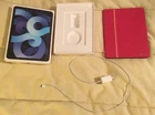 Sky Blue ipad air 4th generation 256gb. Excellent condition, barely used, I bought this for school but ended up not taking the classes so it has sat in a drawer for several months. AppleCare warranty is valid until 4th February 2023. Also included is a protective case that I purchased for it which has a holder for an Apple Pencil. WiFi only. Includes original box and charger