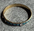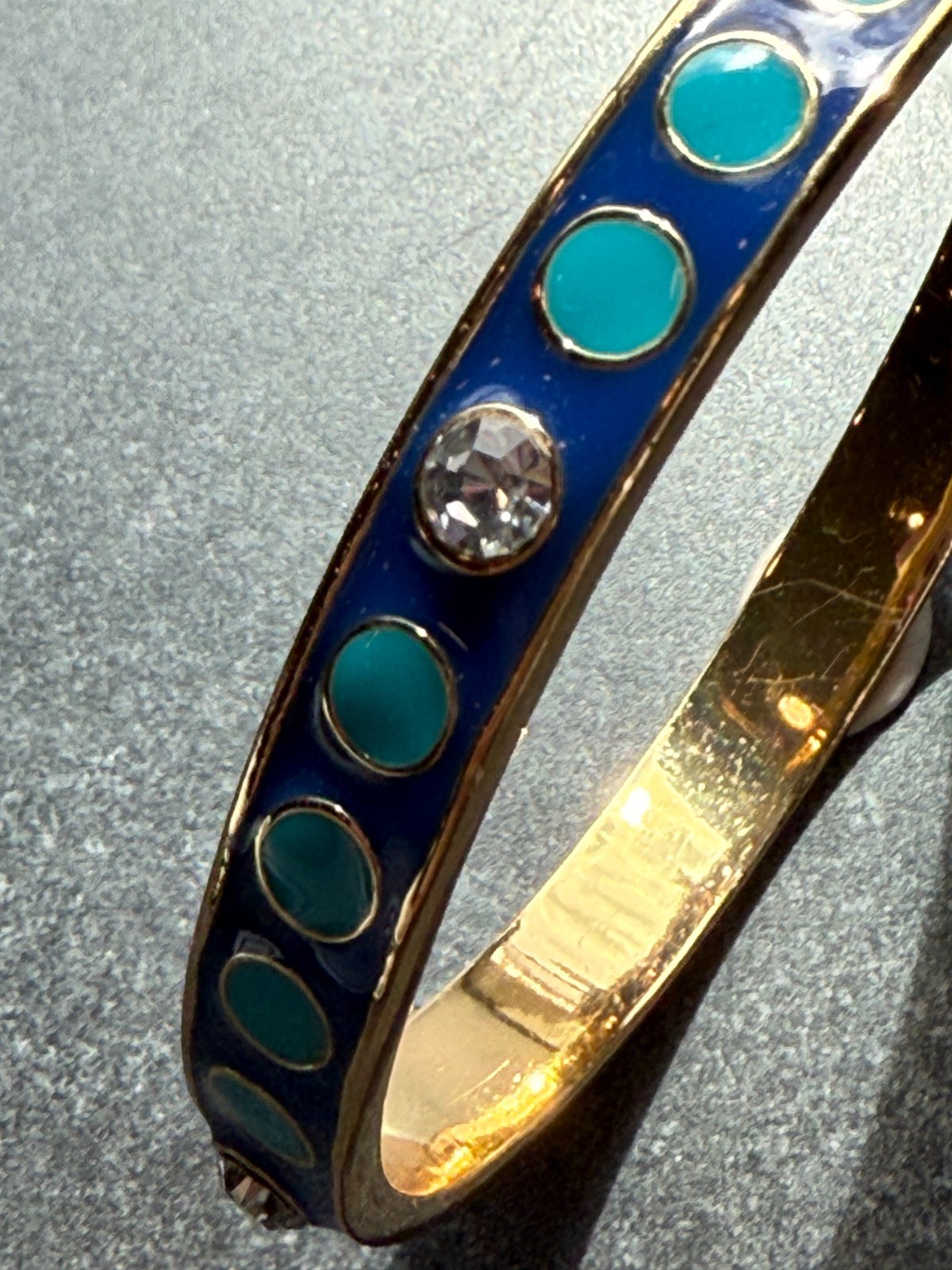 A very nice bangle bracelet by kate spade new york in gold tone metal with blue and turquoise enamel and rhinestone details. Keep for yourself as a very special addition to your collection, or give as a gift for a special someone. Bracelet is size 8. Weighs 0.8 oz. Bracelet branded 'kate spade new york' on the inner band. Is well constructed. Sold as-is in pre-owned and used condition with minor surface wear. There is no clasp. No missing rhinestones. Please see all photos as they are part of the description. Ships to you from our smoke free studio. Item you receive will be the exact item pictured. We are happy to combine shipping for multiple orders.