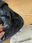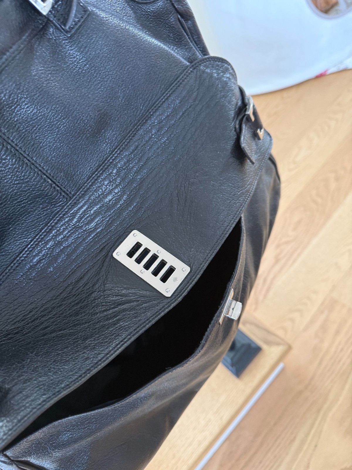 The Mulberry black leather shoulder handbag is a stylish and spacious accessory for women. With an overall size of 24" long (including shoulder straps) x 17" wide x 4" deep (expands to 6"), this bag offers plenty of room for all your essentials and can hold a modest sized laptop. The handle/strap measures 10" high to comfortably accommodate over the shoulder use. The black leather material both on the exterior and handle/strap adds a touch of luxury to the design. The sleek black color, beautiful silver hardware, and shoulder bag style make it a versatile and chic choice for any outfit or occasion. The black lining color complements the overall aesthetic, creating a cohesive and sophisticated look. The front pocket adds extra storage for quick access items. Front clasp has been replaced with square closure instead of original round delicate closure.