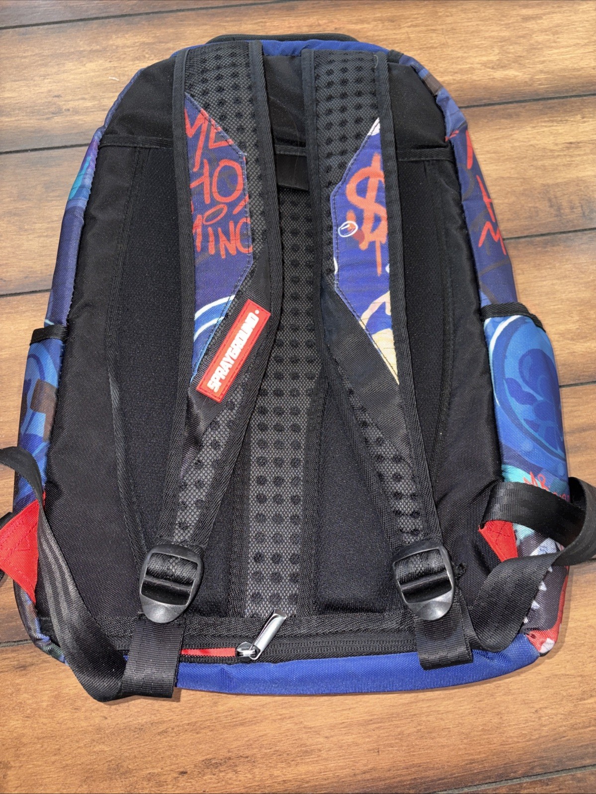 PRODUCT DETAILS Exterior Dimensions: 18" x 6" x 11.5" • Front zipper pocket • Side pockets • Zippered Stash pocket • Ergonomic mesh back padding • Adjustable Straps for custom sizing • Nylon Zippers with Metal Hardware • Metal "Sprayground Authentic" badge • Slide through back sleeve connects to Carry on luggage to free your hands Interior Separate Laptop compartment • Separate Velour sunglass compartment • Mesh organizer pocket Fabric Durable 900D Poly water-resistant fabric