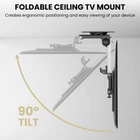 FOLD UP Ceiling TV Mount, for Flat Ceiling, Pitched Roof, Under Cabinet and Corner Installations, Support Most 17''-37'' Monitors up to 20kgs/44lbs Transform Your Outdoor Space - Experience outdoor entertainment like never before with our innovative Flip Down TV Mount. Elevate your gazebo, pergola, or patio into a captivating entertainment hub under the open sky. Sleek & Versatile Design - Seamlessly blending into any outdoor setting, our Flip Down TV Mount adds elegance to your space. The black powder-coated finish ensures durability, even in harsh conditions. Turn your patio into a sophisticated outdoor theater that impresses your guests. Unparalleled Flexibility - Tilt, swivel, and rotate your TV effortlessly for the perfect viewing angle. Whether hosting a lively BBQ party or enjoying a quiet evening under the stars, our robust articulating arm ensures smooth movement, so every seat has a great view. ADD TO CART now. Easy Installation, Universal Compatibility- Our Flip Down TV Mount includes a comprehensive installation kit and instructions, making setup a breeze. With universal VESA compatibility, it confidently fits most TV models, allowing you to mount your desired screen size with convenience. Weatherproof & Durable- Crafted from weatherproof aluminum alloy, our mount withstands the elements, ensuring long-lasting performance. Don't settle for less when it comes to outdoor durability and reliability. Trust our Flip Down TV Mount to deliver outstanding results. Heavy-duty Capacity, Peace of Mind - With a robust weight capacity of up to 44 pounds (20 kgs), our mount securely holds a variety of TV screens. Enjoy your outdoor entertainment without worrying about stability or safety concerns. Invest in quality and enjoy peace of mind. Height Adjustable & Space-saving - The mounting plate offers a height adjustment capability of up to 5.125 inches, allowing you to achieve the perfect viewing position. Maximize your space by folding up the TV mount when not in use, keeping your outdoor area clutter-free