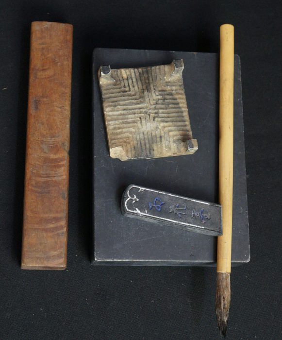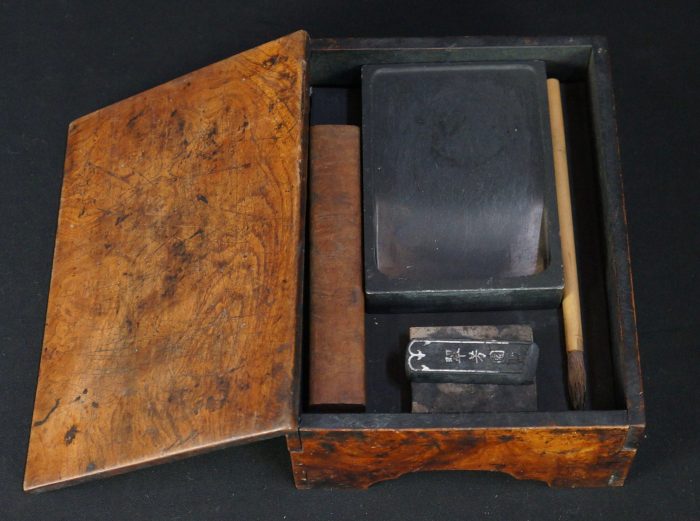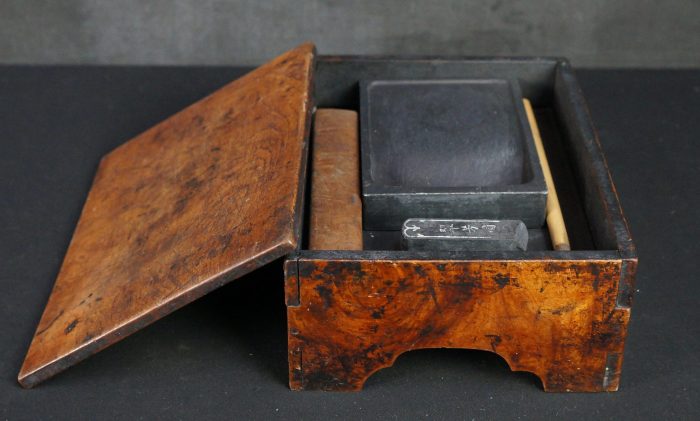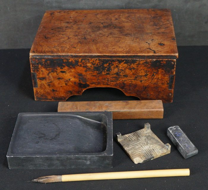 Antique Wabisabi Japanese Suzuribako writing set, complete of Suzuri stone, ink bar, Fude brush, Bunchin paper weight and stone ink bar holder (one leg damaged). Ware from extensive and long usage, old ink stains on all surface. Nice patina and character, immediately usable.
