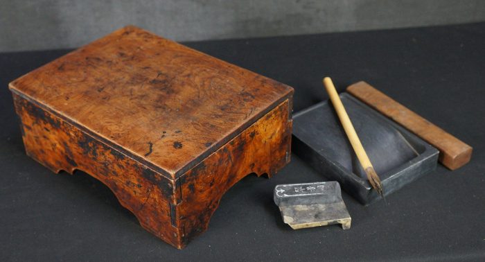 Conditions: medium good, ware from extensive and long usage, old ink stains on all surface, stone ink bar holder one leg missing. Please see photos.