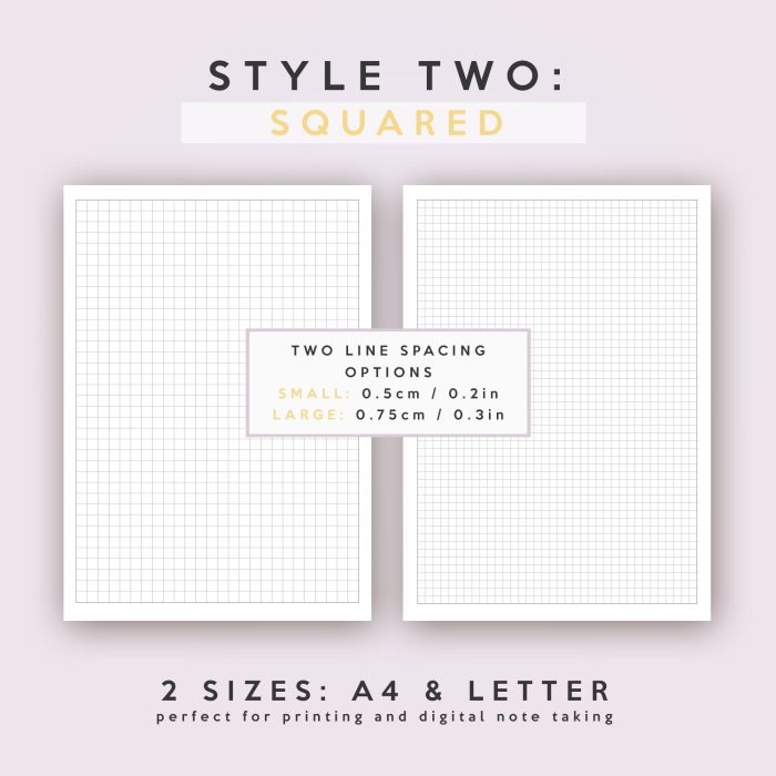– Three styles of paper: lined/ruled, squared/grid, dotted.