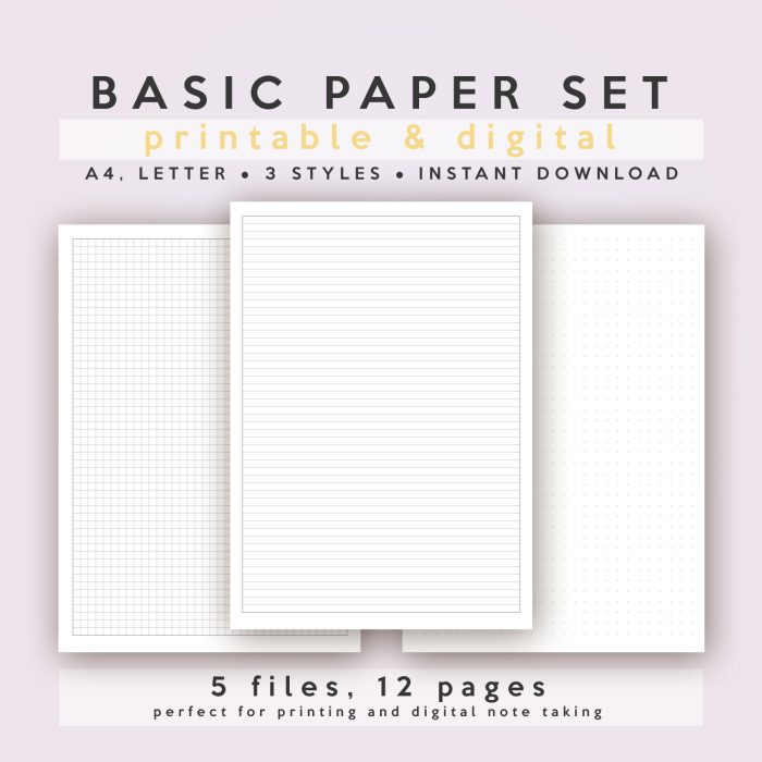 Be the first to review “Basic Paper Set (Lined/Ruled, Squared/Grid, Dotted) | A4 and Letter | Printable, Digital (GoodNotes/Notability, etc) | Instant Download”