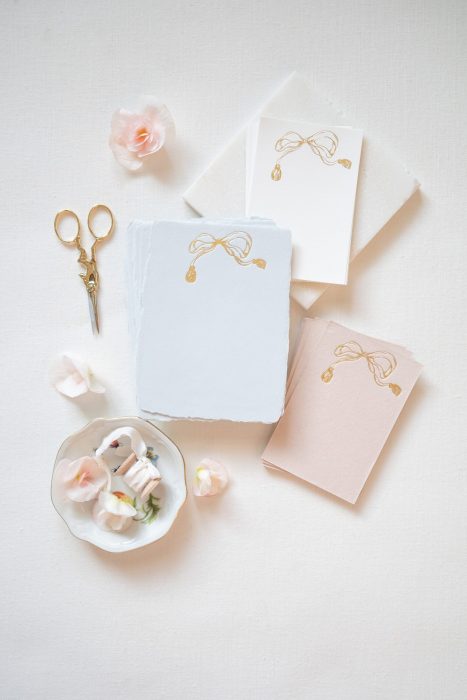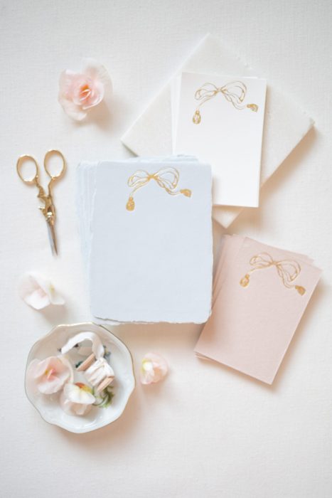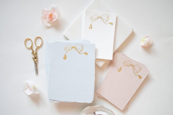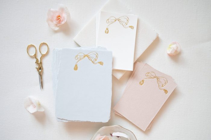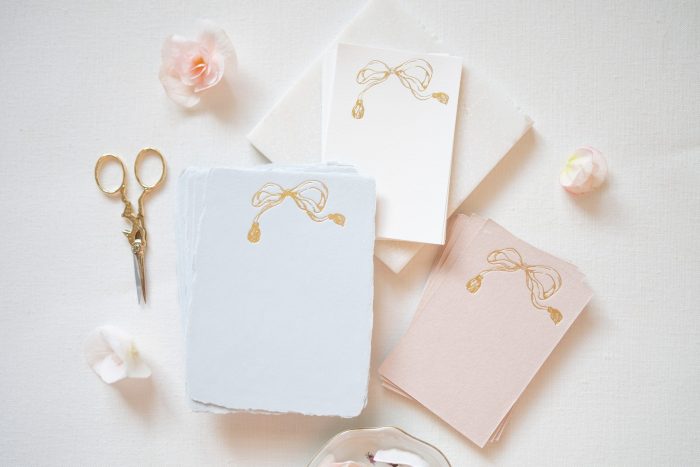 Bow and Tassel Hand-drawn Gold Foil Pressed Note Cards on Handmade Paper, Handmade Paper with cut edge, OR Cardstock- Set of 5 Seller details$15.00