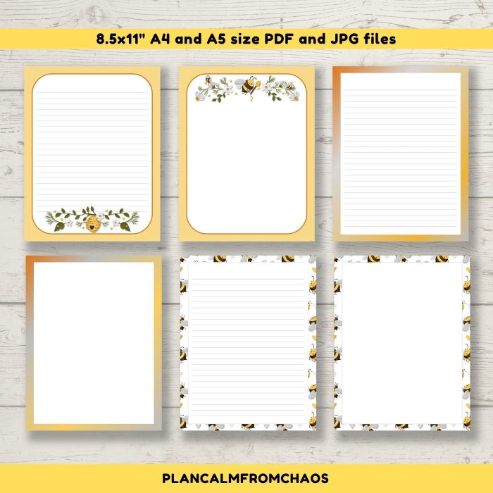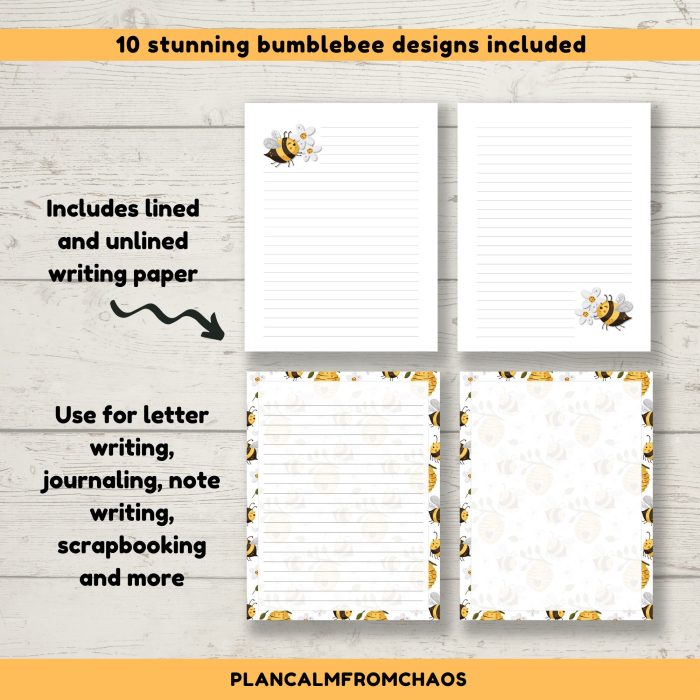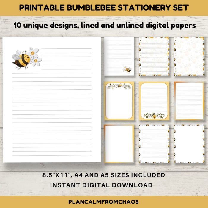 Bumblebee Printable Stationery, DIGITAL DOWNLOAD, Printable writing paper in 10 Bumblebee designs. A4, A5 and 8.5×11 pdf jpg digital papers$2.46