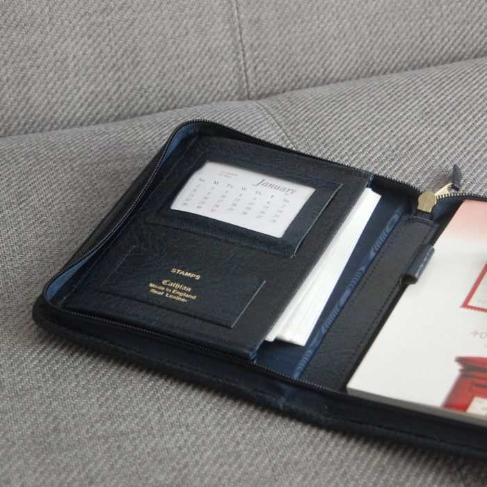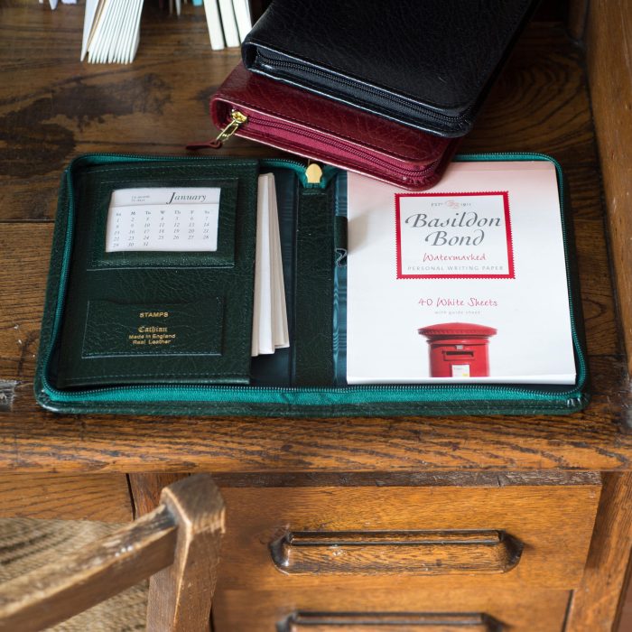 Internally they are provided with a pad of plain Basildon Bond watermarked paper and envelopes, a perpetual calendar and stamp pocket.