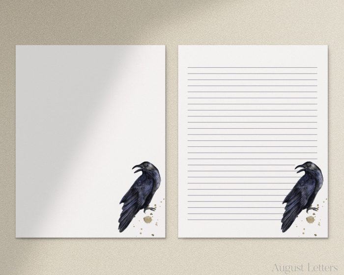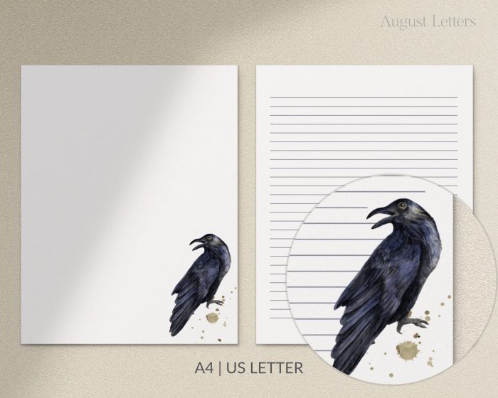 Dark Blue Raven V2, Halloween, Printable Letter Writing Paper / A4, 8.5×11 / Lined Unlined / Digital Stationery Paper / Gothic / Watercolor$2.40